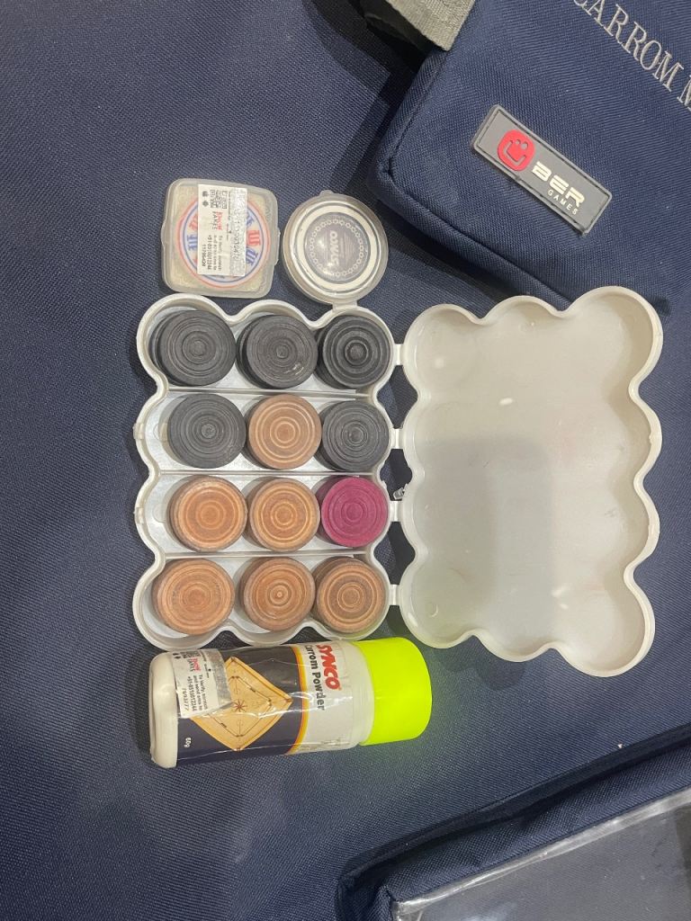 Complete UBER Games Carrom Board set in excellent condition. Carrom is a classic South Asian tabletop game similar to billiards/pool, played by flicking a striker to pocket wooden pieces.