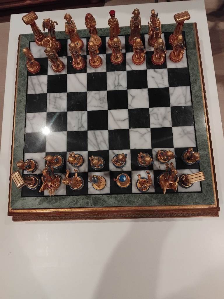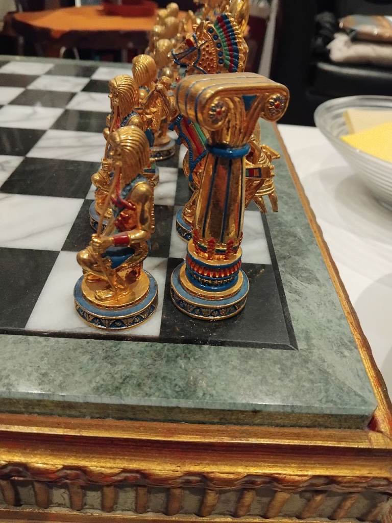 Compton and Woodhouse ‘The Golden Treasure of Tutankhamun’ Chess Set – an exquisite collector’s set featuring gold plated cast metal pieces intricately modelled as Egyptian figures, each capturing the grandeur and symbolism of ancient Egypt. The set is housed in a custom fitted case, complementing the gilt-framed chess board with its luxurious marbled top. One piece has head AF. Kings stand 10.5 cm high, and the marble chess board measures 45.5 cm square. A stunning combination of artistry, history, and opulent design, perfect for display or play.