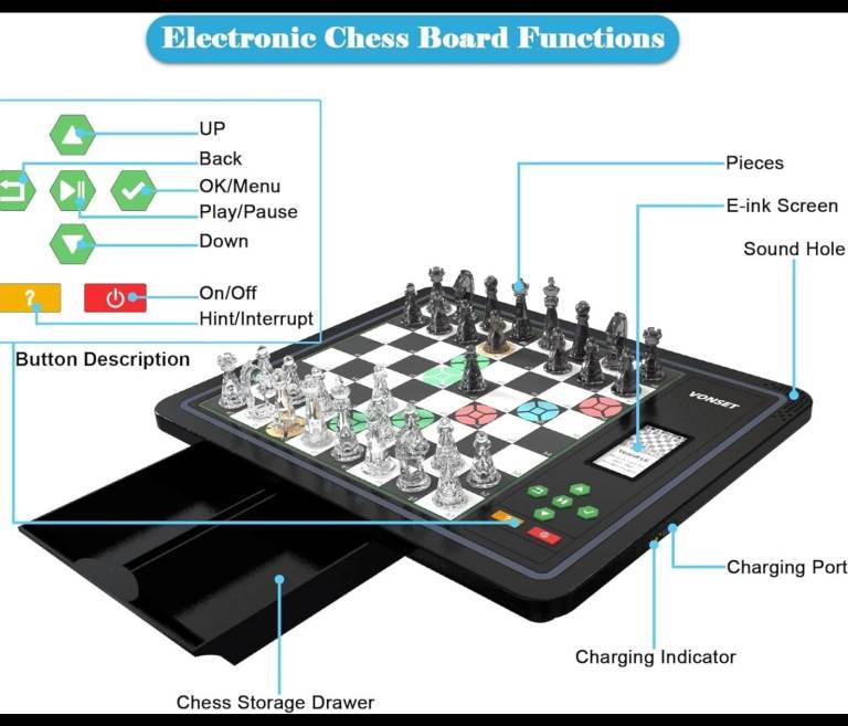 Vonset L6 Electronic Chess computer, only used only a few times, so in new condition. Ideal for beginners to master strevgh on the higher levels. Comes with a USB power lead to charge, you will need your own charging brick to charge it, any phone one will do the job, comes with instructions.