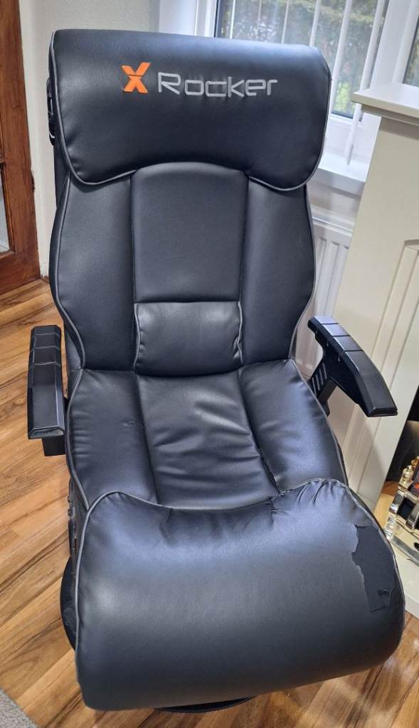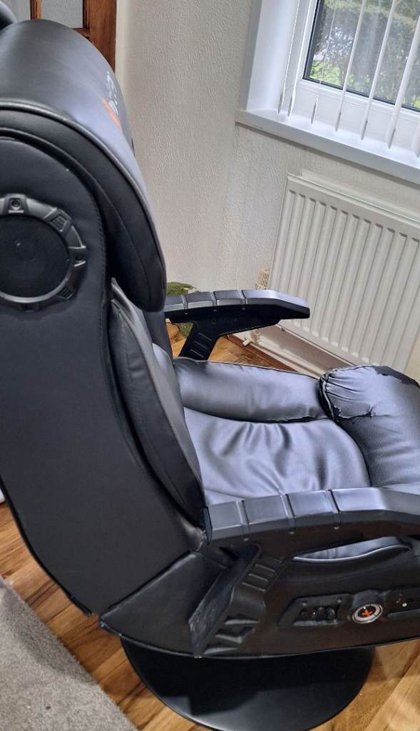 XRocker Gaming Chair foldable, in used condition but good general condition, comse with power cable, please note there's small damage in Chair leather. Check the photos, but doesn't effect.