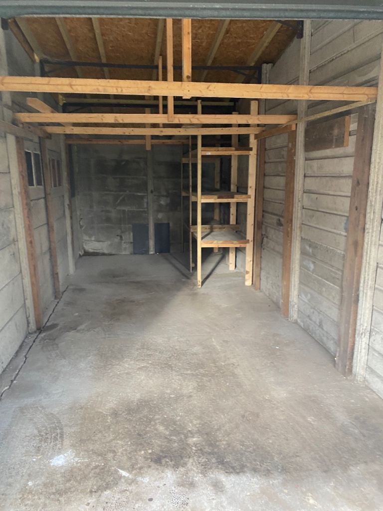 Large garage for storage or car if wished, but we would have to take down shelving and dispose of but not a problem.