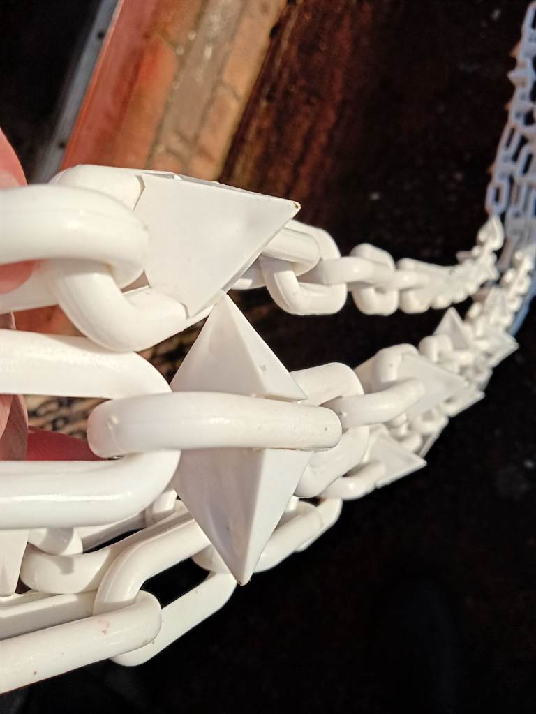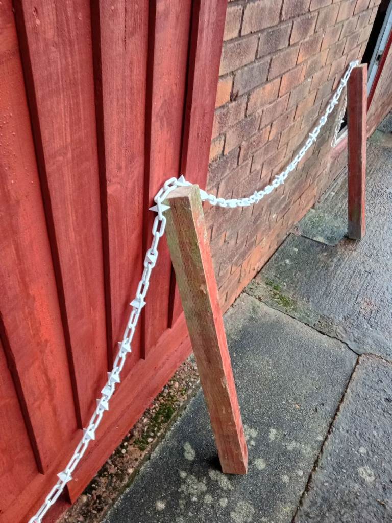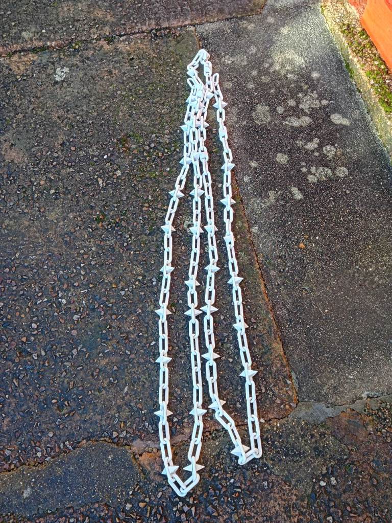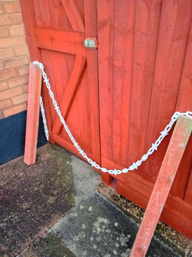 3 wooden posts 3 foot long and 3 inches square and large size white plastic chain with spikes 17 foot long. Ideal for any gardening or driveway. Cash on collection from Elmfield Crescent Exmouth EX8 3BL.