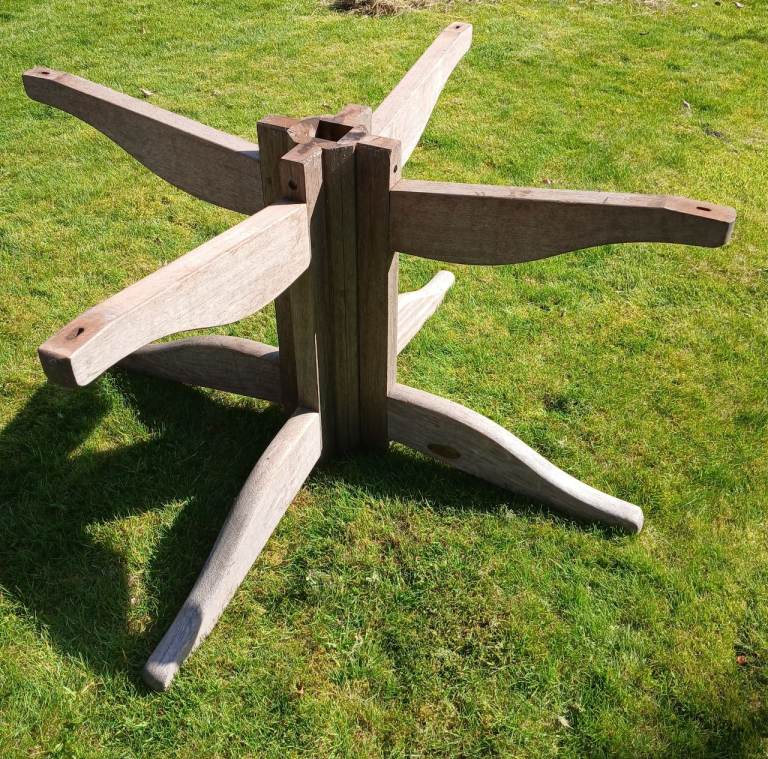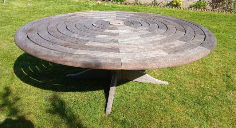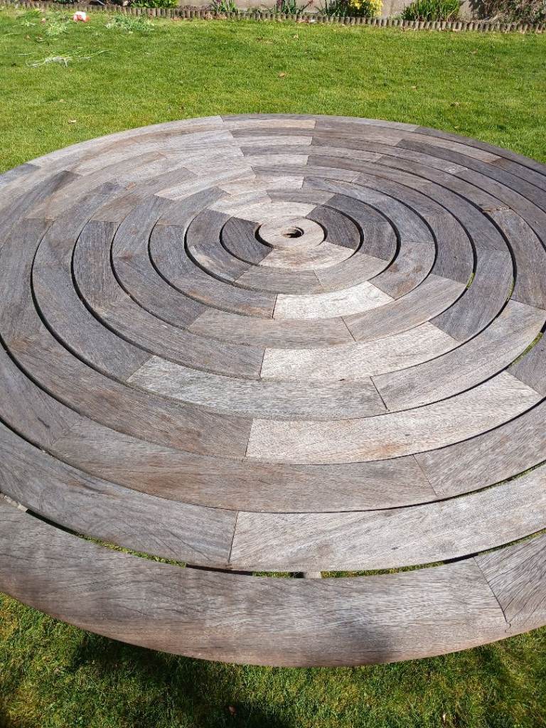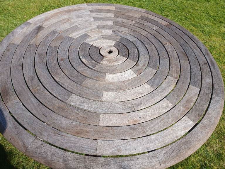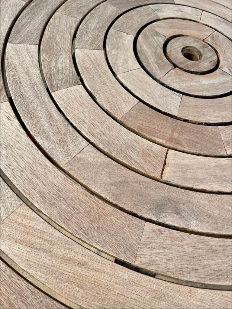 A weathered teak garden table characterized by its distinctive concentric, circular slatted top design. often referred to as "Ring Tables" or part of the "Bengal" range.