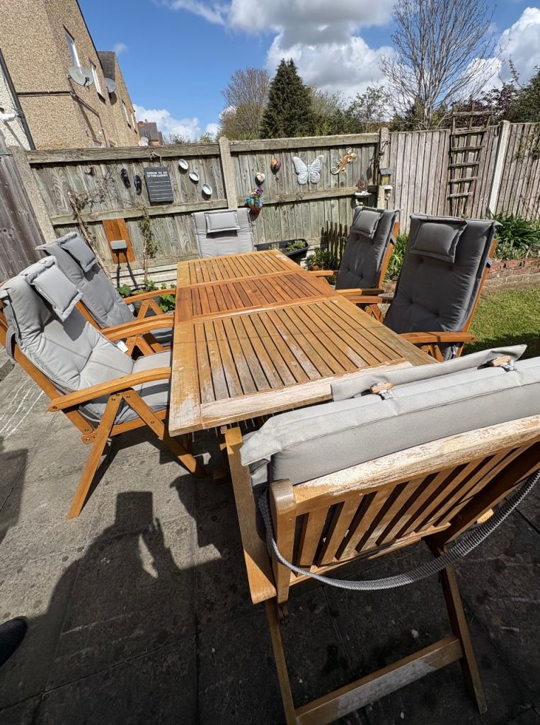 Posting for 13+ yearsBeliani 6-seater extendable table garden furniture set. Grey seat covers.