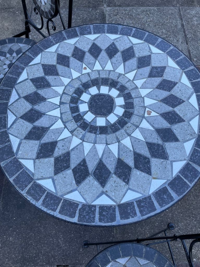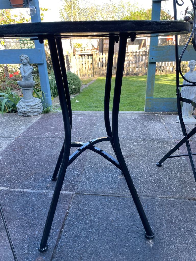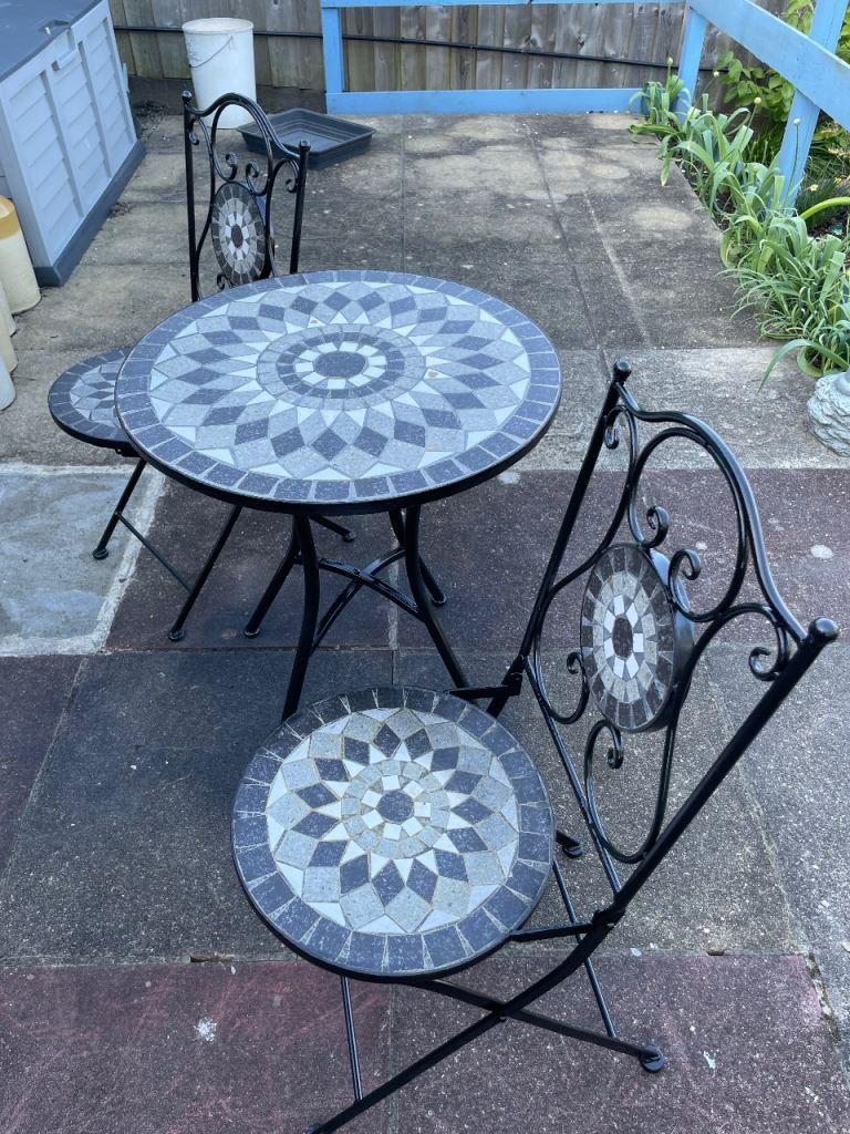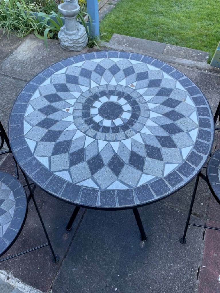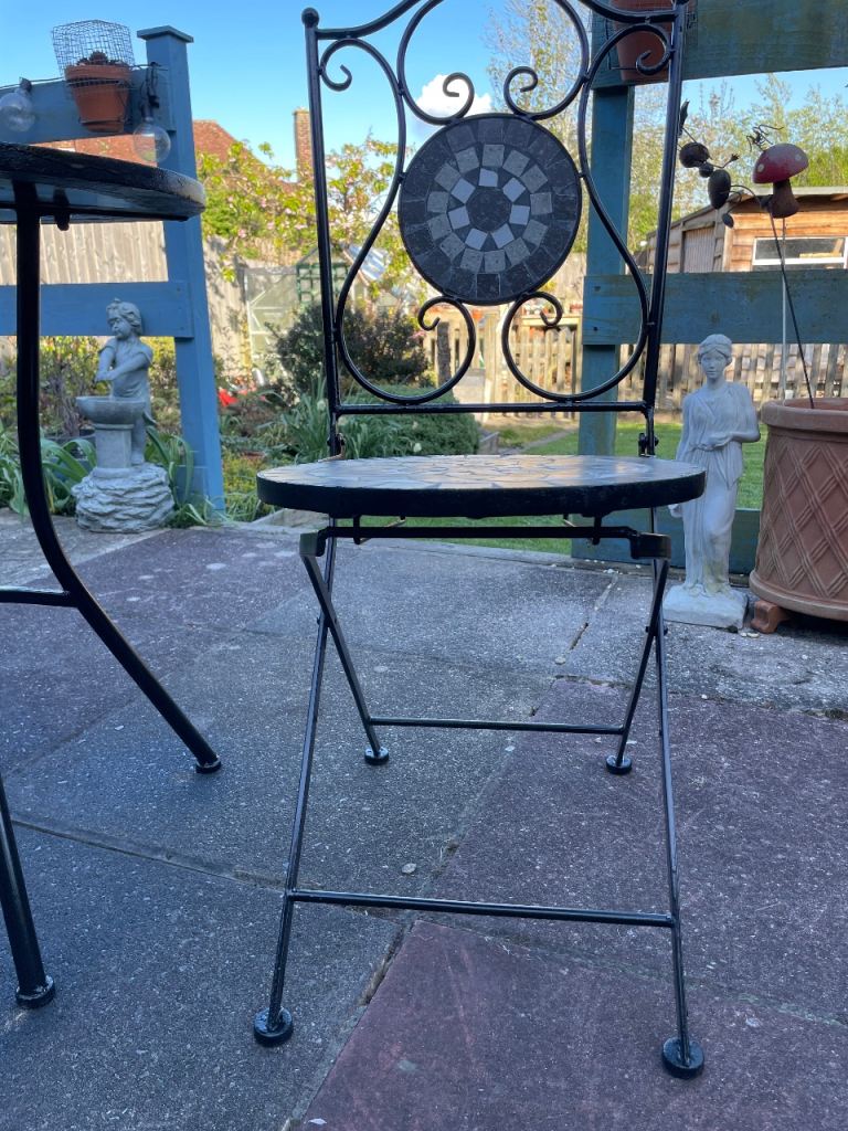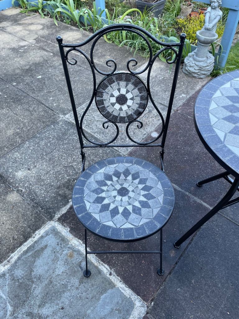 Bistro table and two folding chairs in good condition. Metal frame work with mosaic tiled table top and chair seats, quite heavy. Has recently been wire brushed and sanded, and had a coat of black hammerite paint. Only down side is two chips on table top. Please see photos for further description