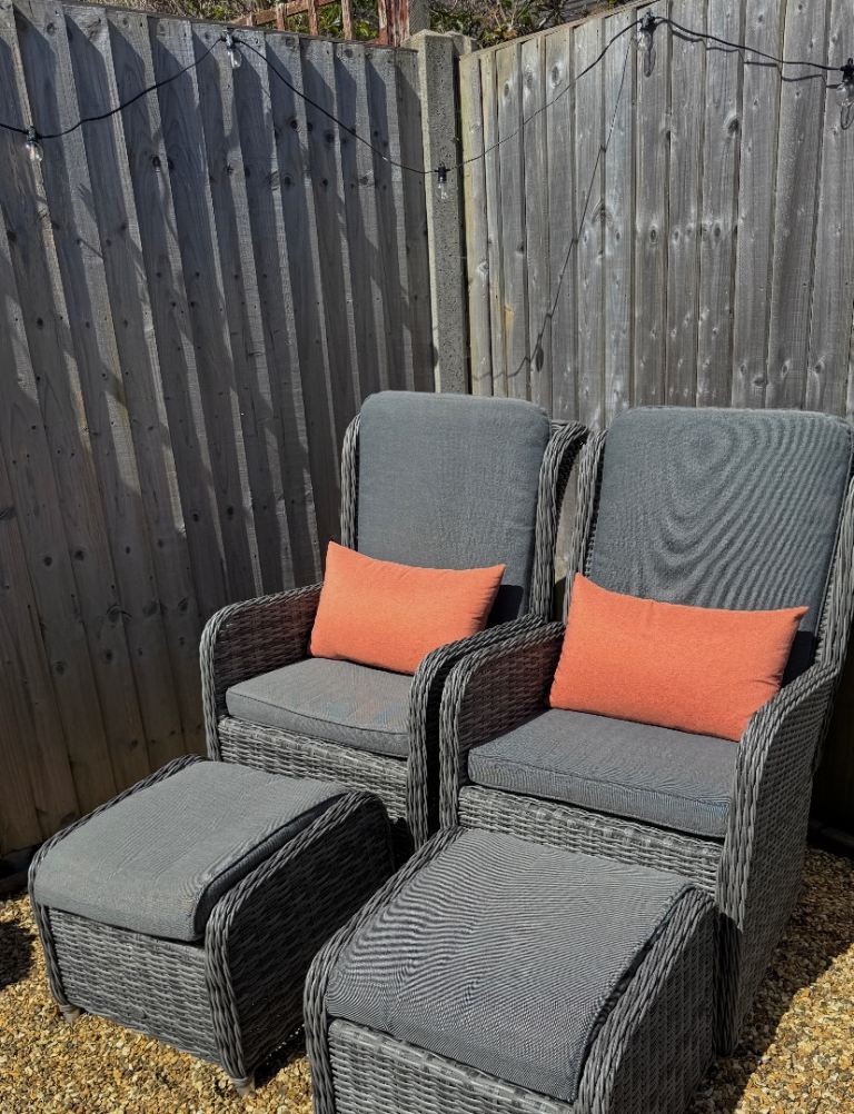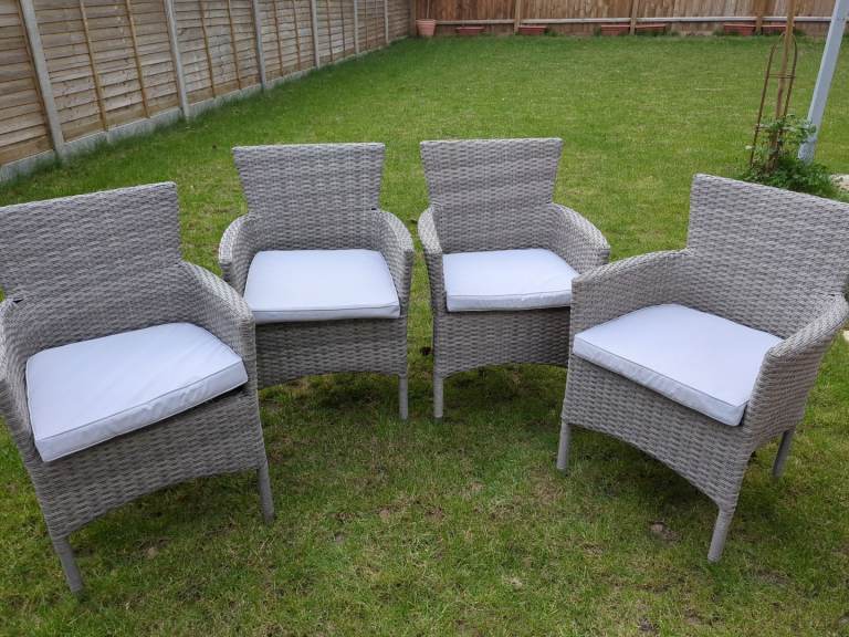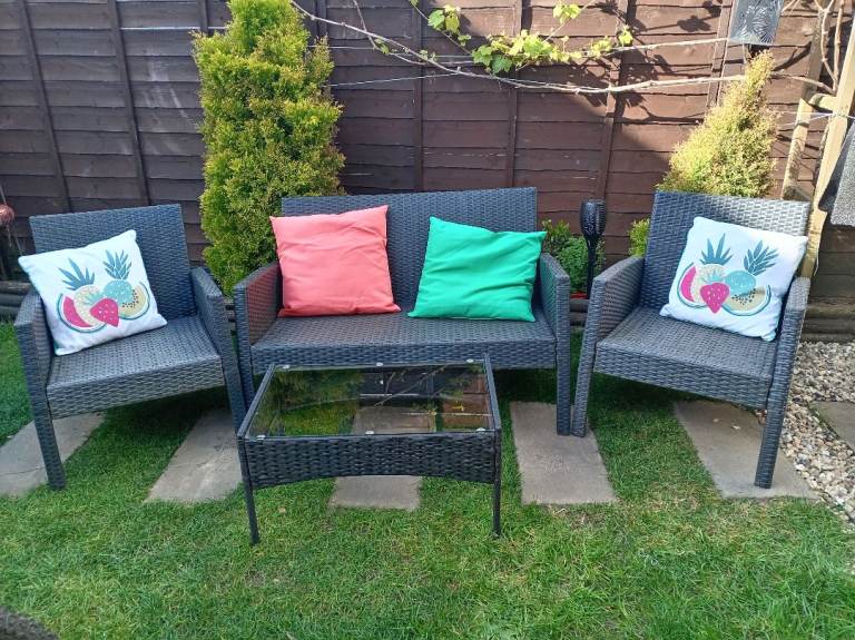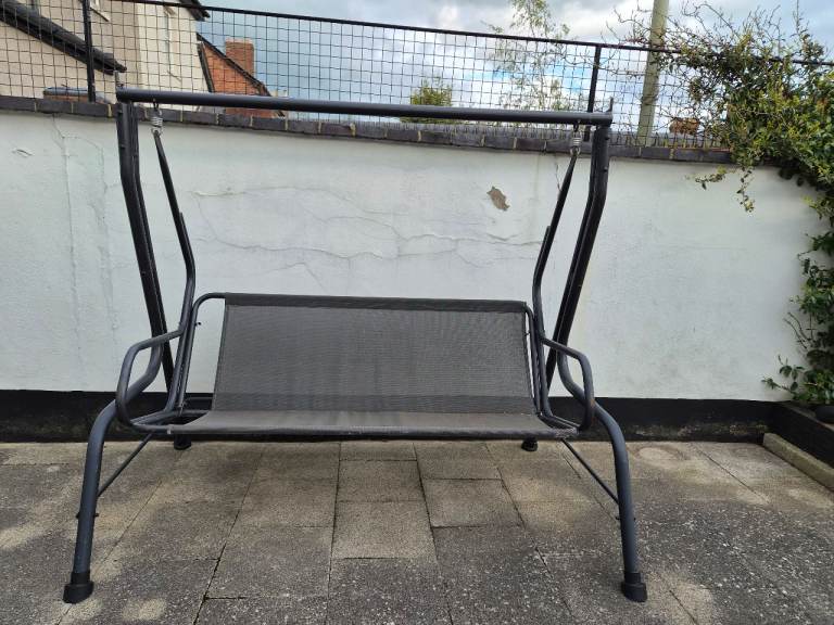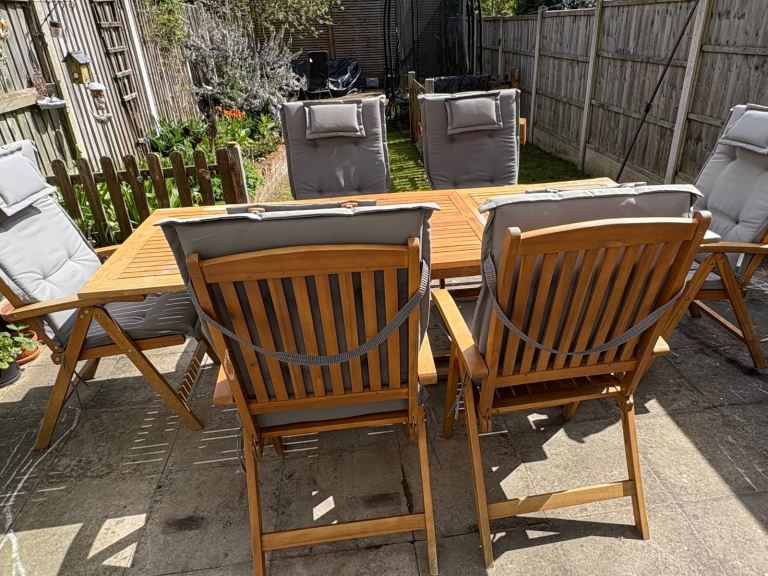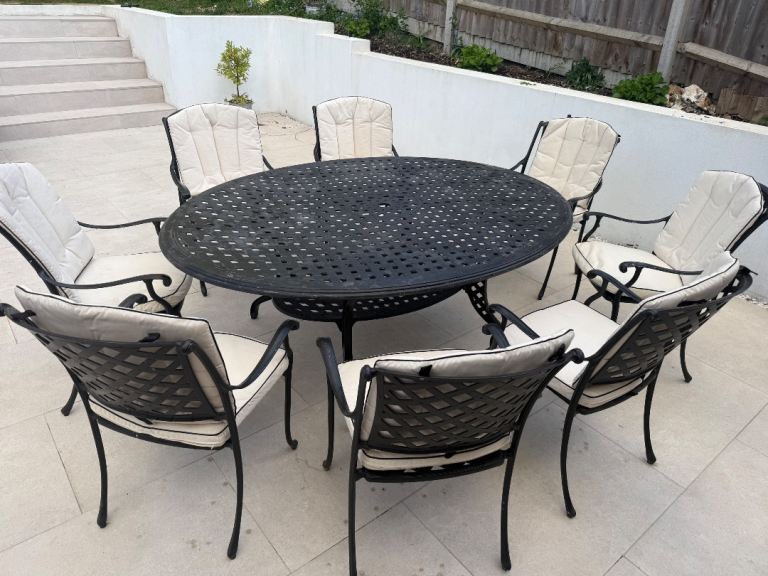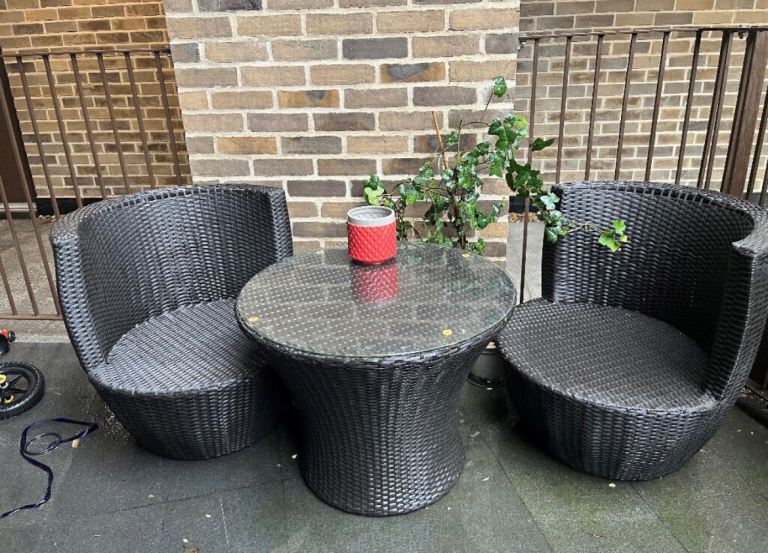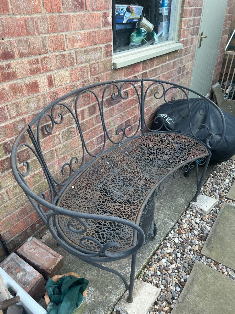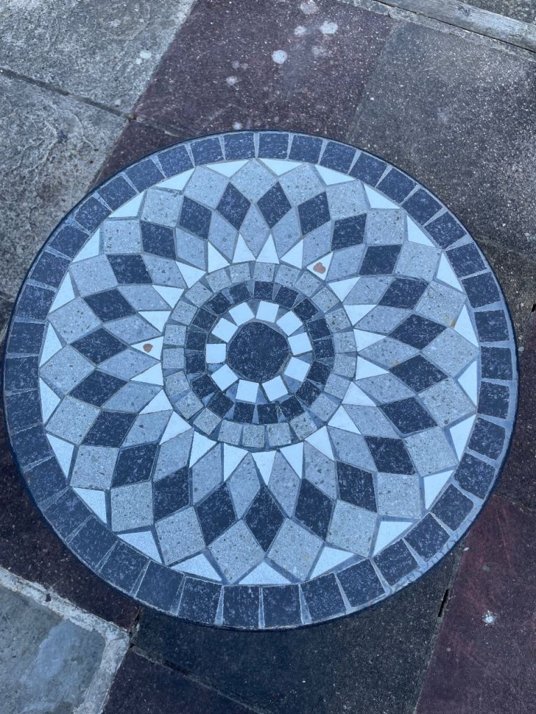 Bistro table and two folding chairs in good condition. Metal frame work with mosaic tiled table top and chair seats, quite heavy. Has recently been wire brushed and sanded, and had a coat of black hammerite paint. Only down side is two chips on table top. Please see photos for further description
