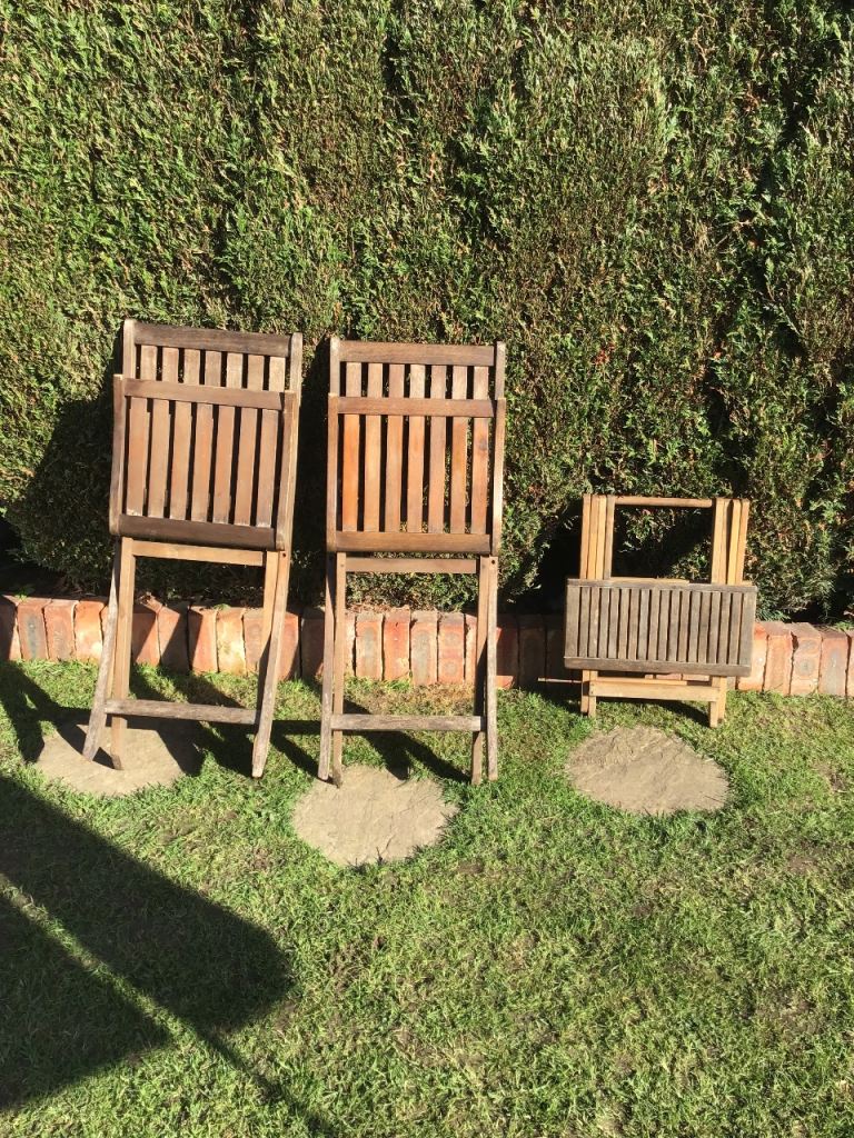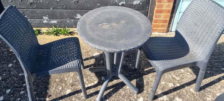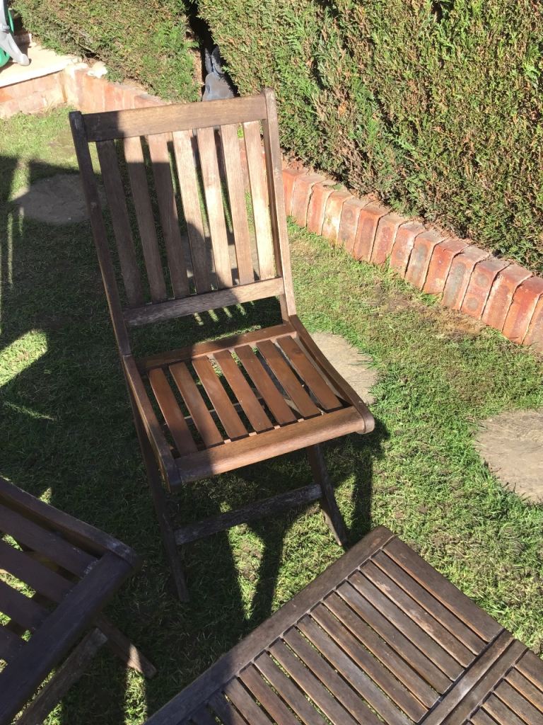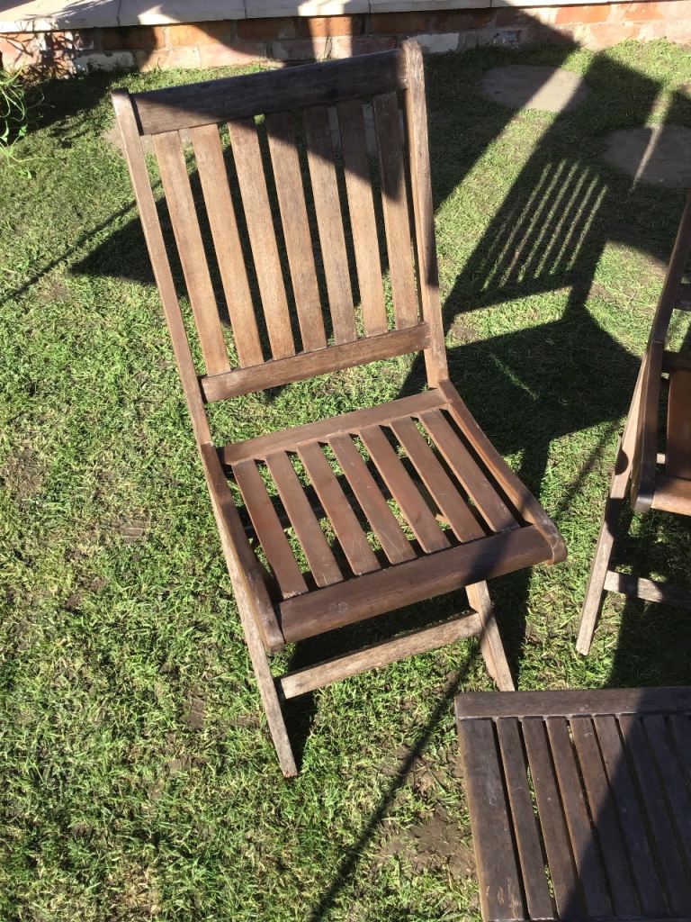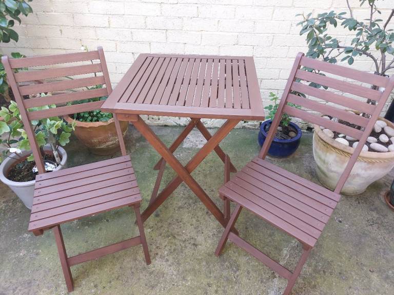 Weathered table and 2 chairs, very sturdy , perfect for a balcony or courtyard, can be folded for easy storage.