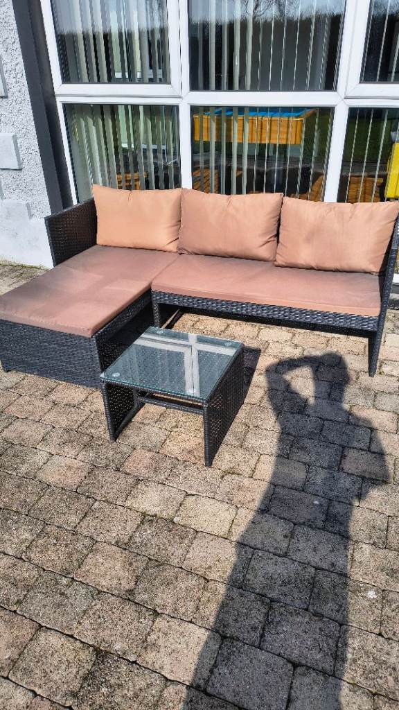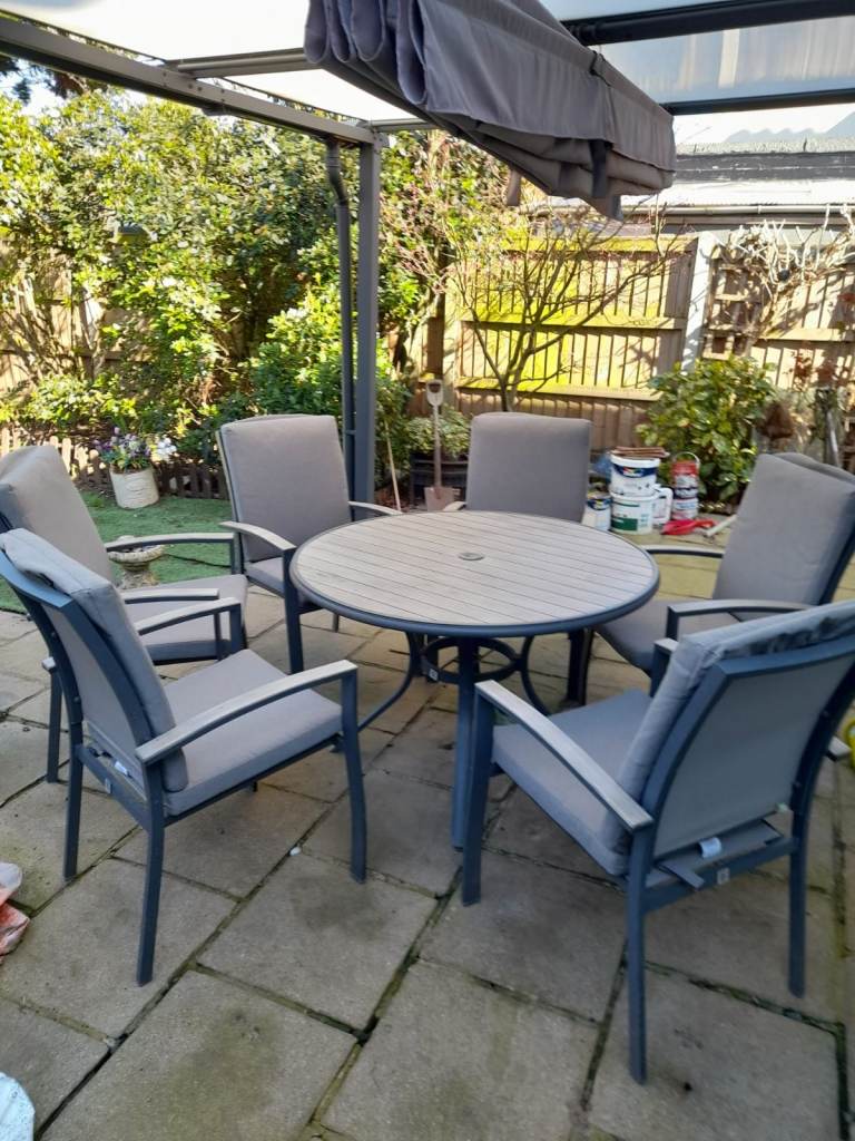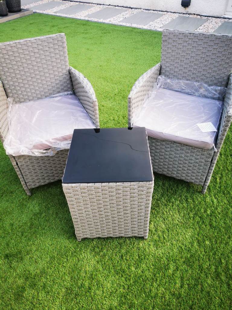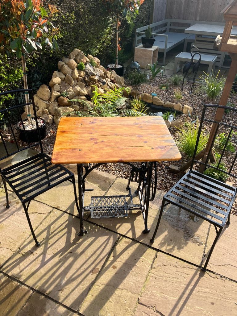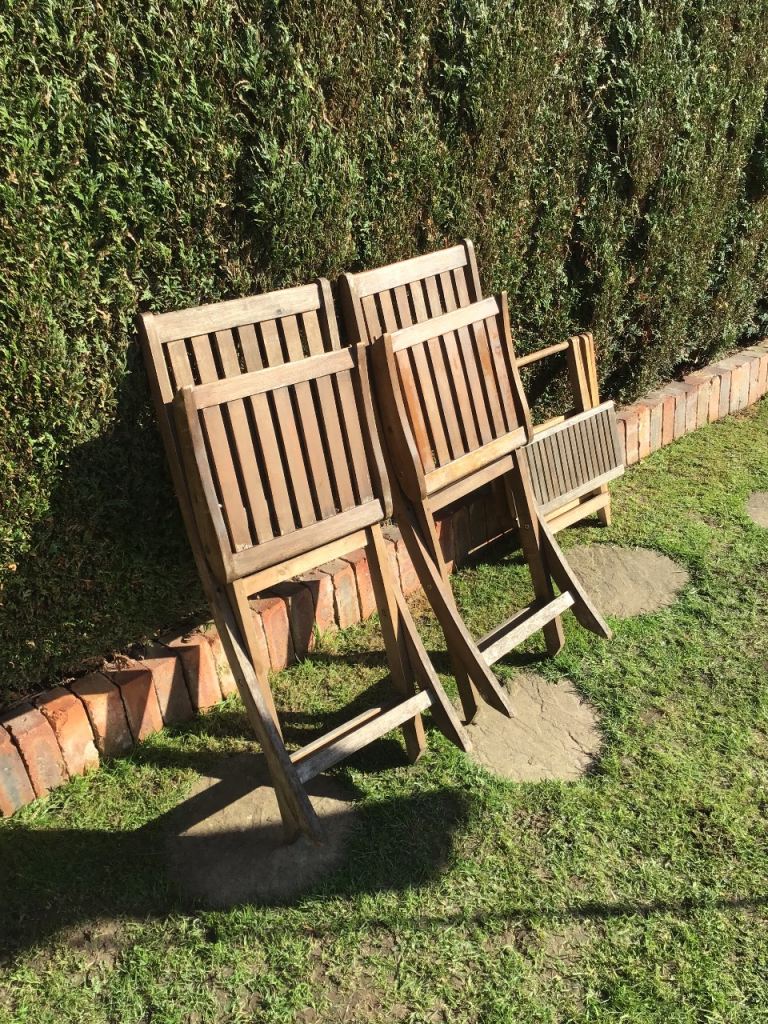 Weathered table and 2 chairs, very sturdy , perfect for a balcony or courtyard, can be folded for easy storage.