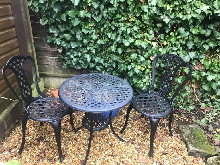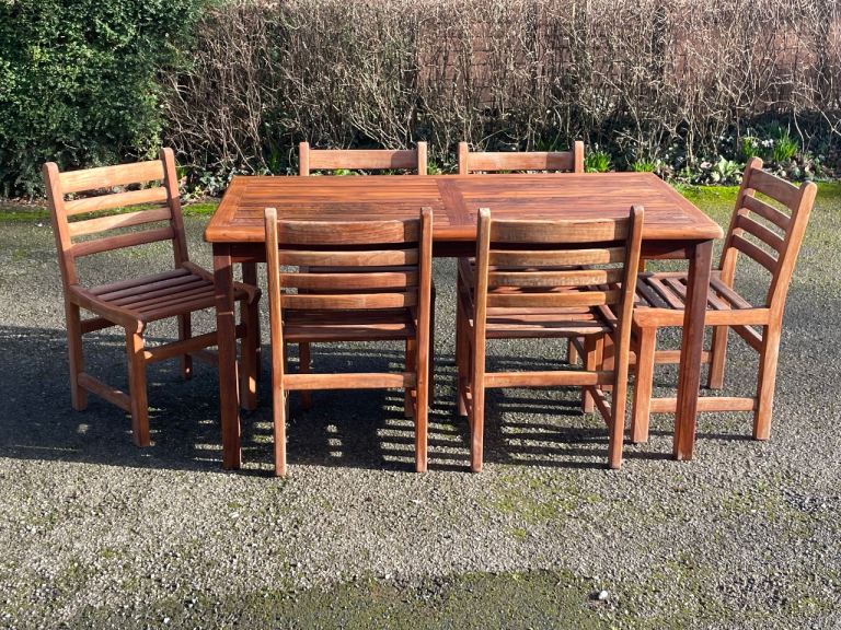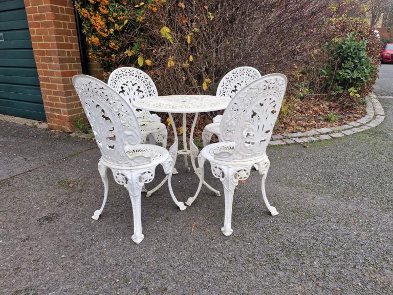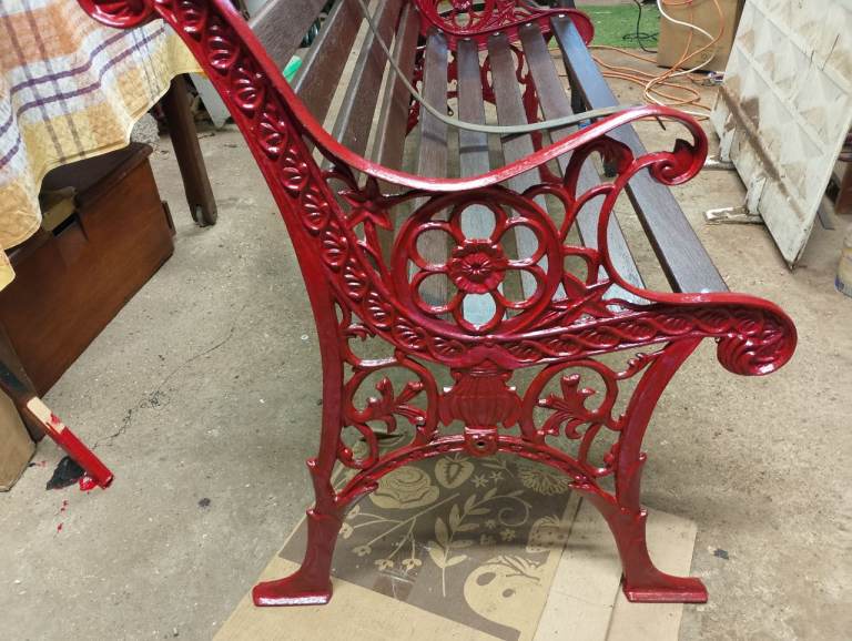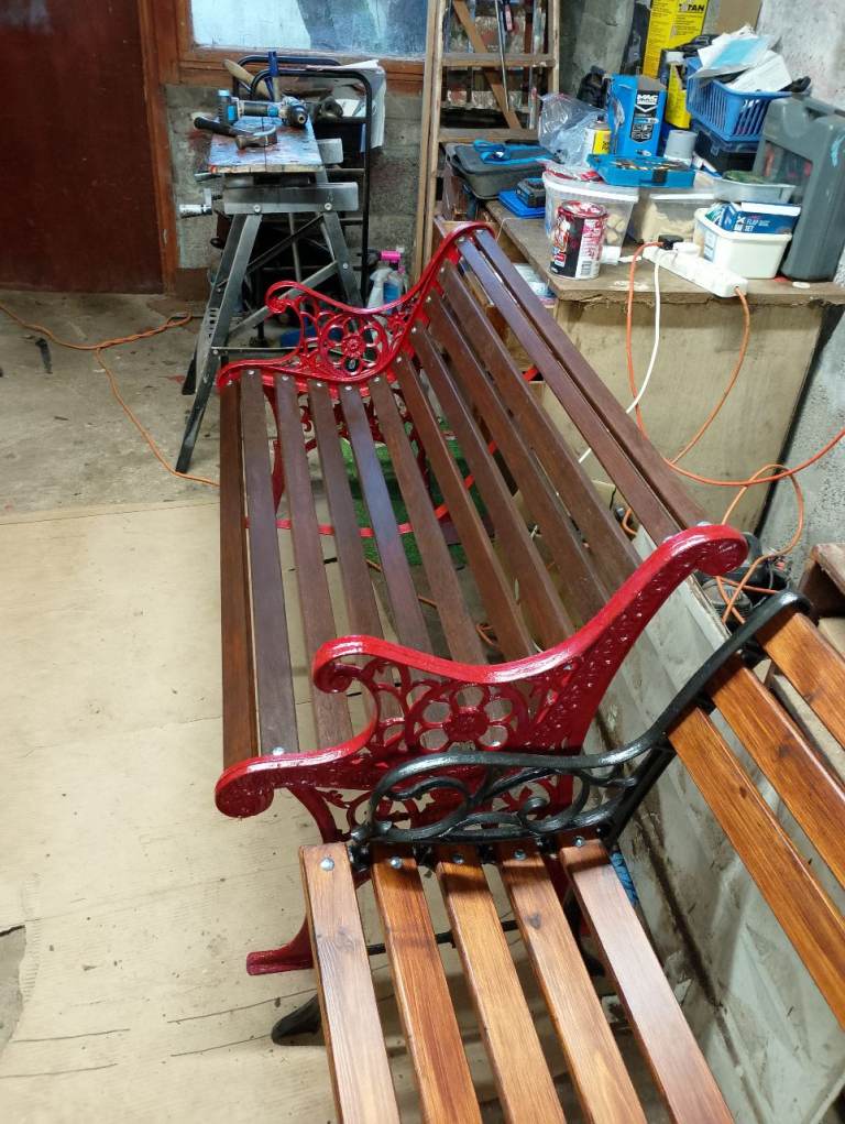 Fully refurbished garden bench with ornate cast iron gables and hardwood slats. All metal parts are painted with Hammerite and wood slats given three coats of weatherproof stain. New stainless fixtures throughout. A solid bench to enhance the Spring garden.