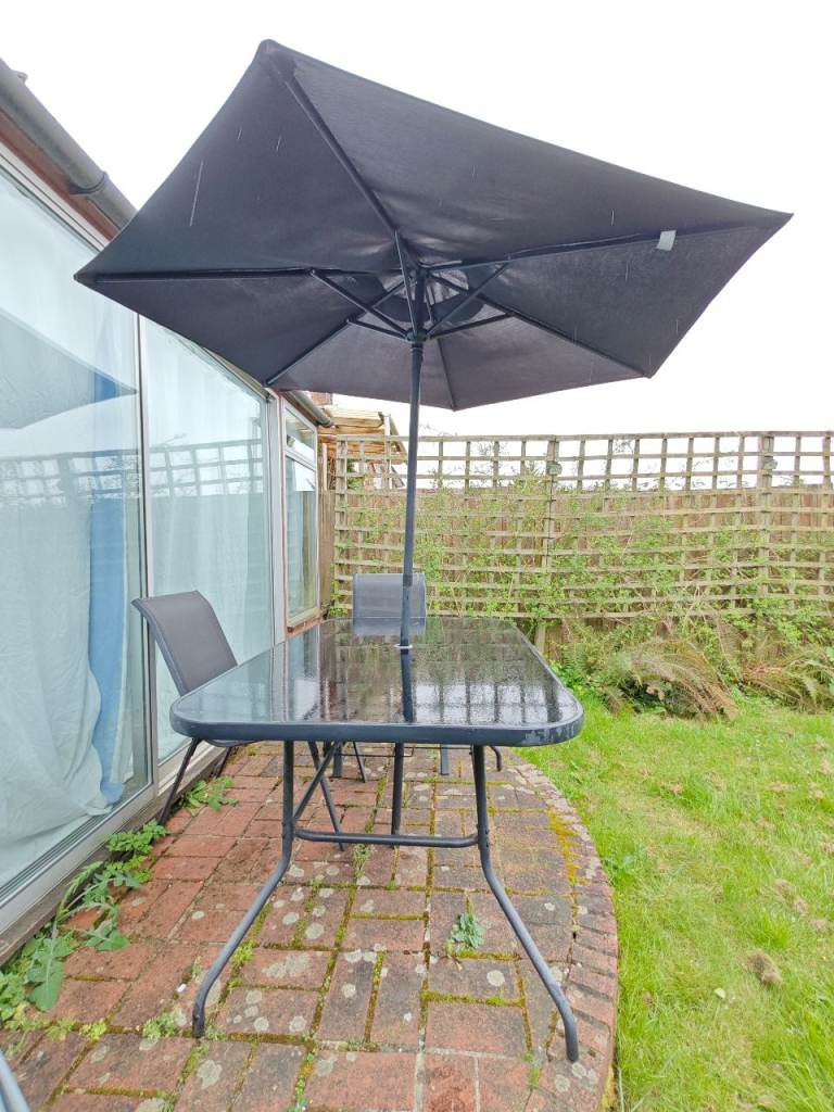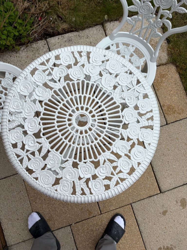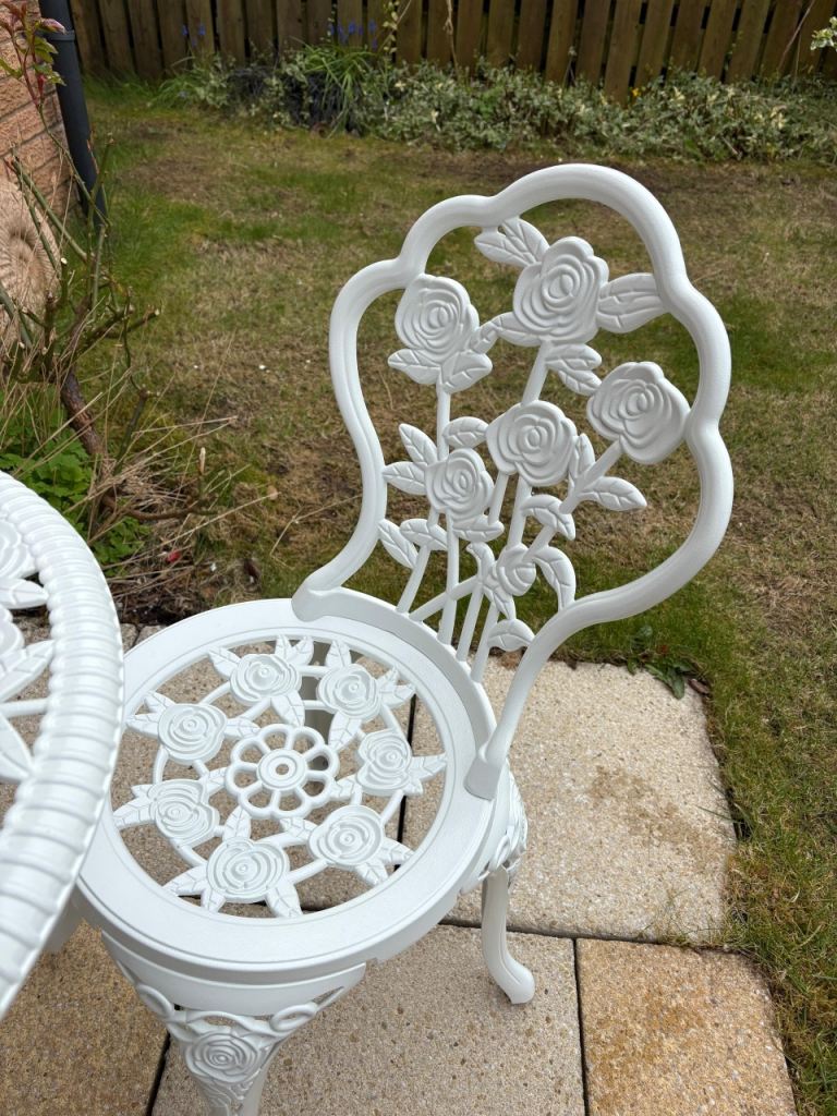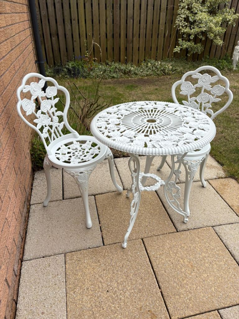 White cast aluminium bistro table and 2 chairs. Brand new out of box. Perfect. Table 60cm diameter. Chairs 38cm seat diameter.