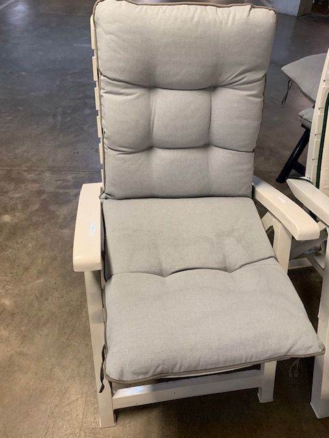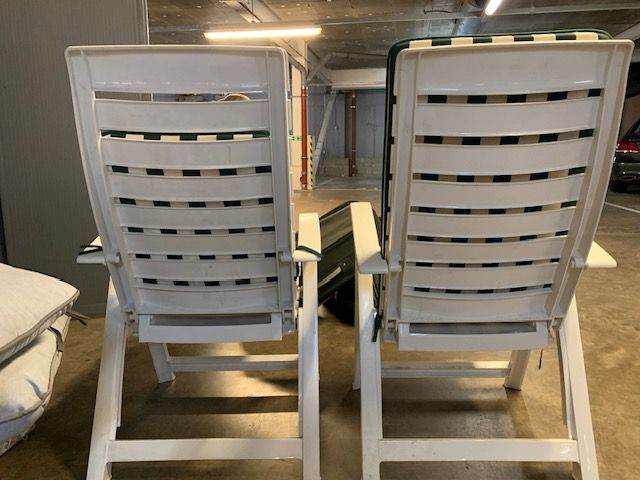 2 x Folding Garden Loungers White Colour Outdoor Dining Chairs - complete with 1 set of green striped cushions and 1 set of pale blue denim cushions