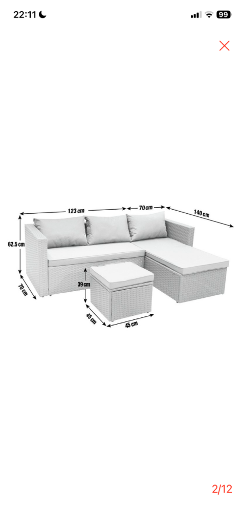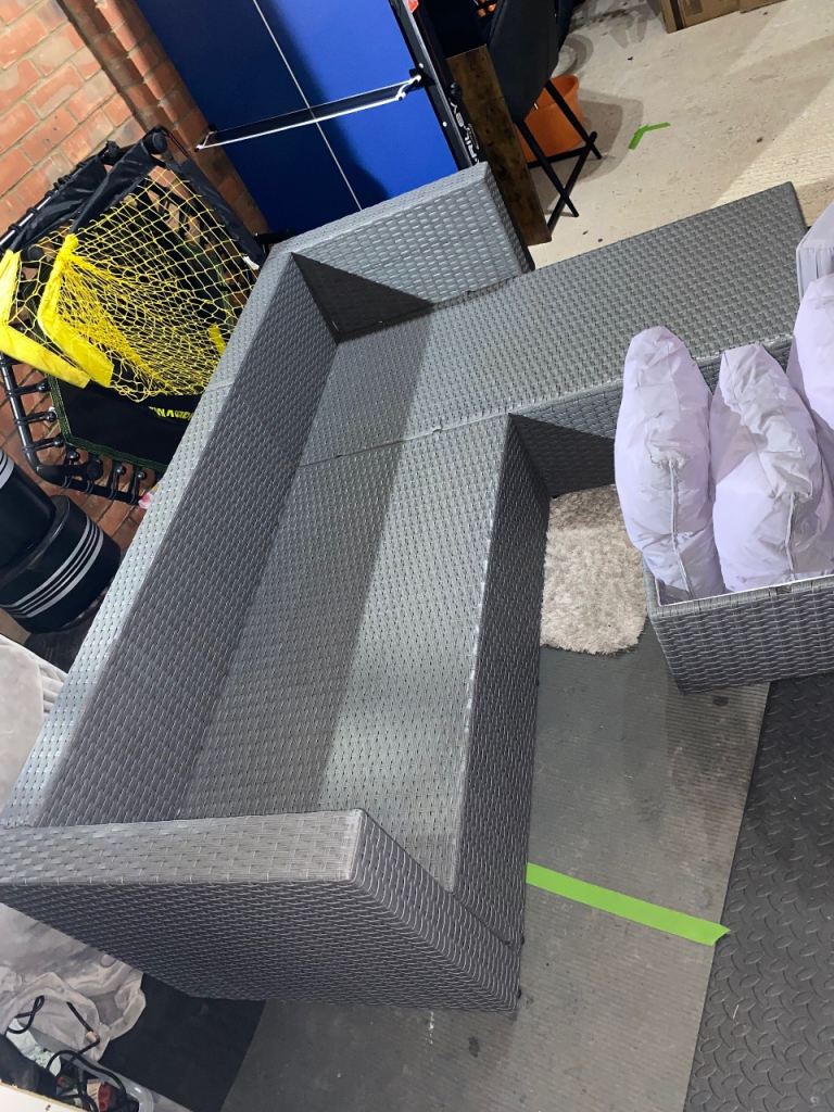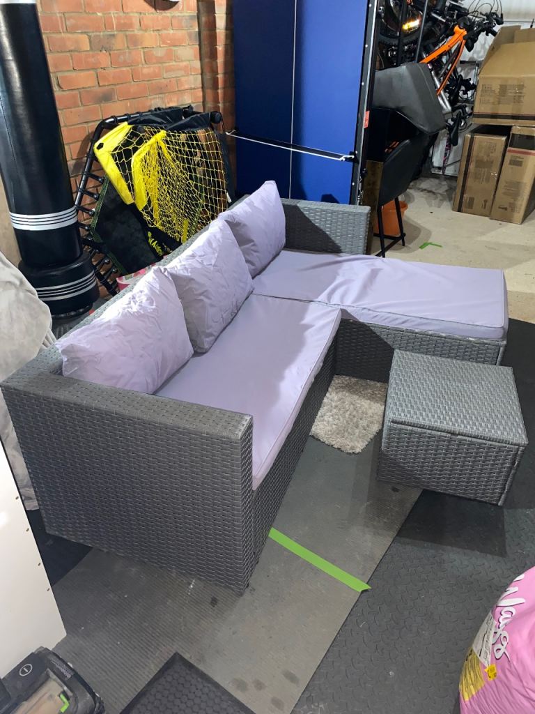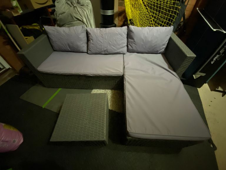 Excellent condition corner sofa from argos. Comes with cushions as per photos. Cushion covers can be removed and washed. Includes foot stool with storage. No rips or holes. Comes whole and probably best not to be taken apart as some screws rusted.