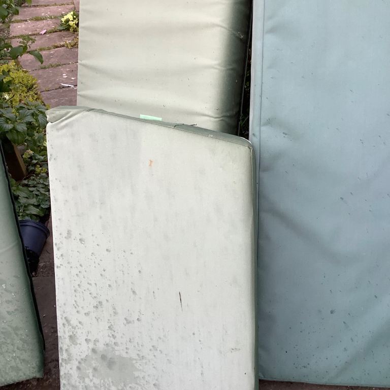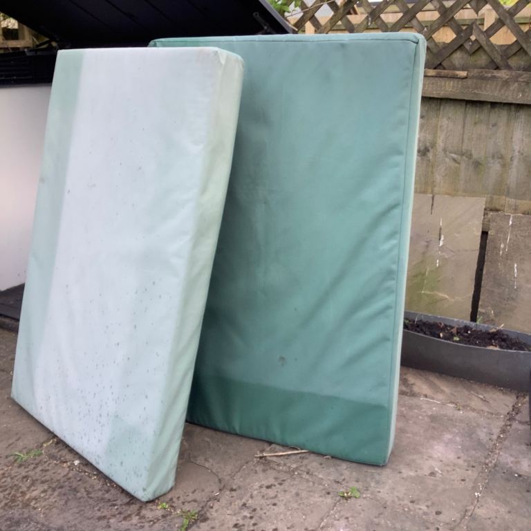 Pallet furniture seat and back cushions, for a corner unit. The cushion size fits the standard Euro pallet. There is a slight variance in the shade of green between the seat and back cushions. There is also some fading from the sun, but they still repel water and the foam is good.