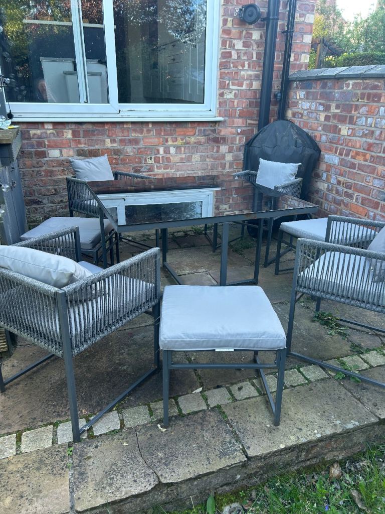 Outdoor furniture set, glass topped table with 4 chairs and 4 stools. Including all cushions.