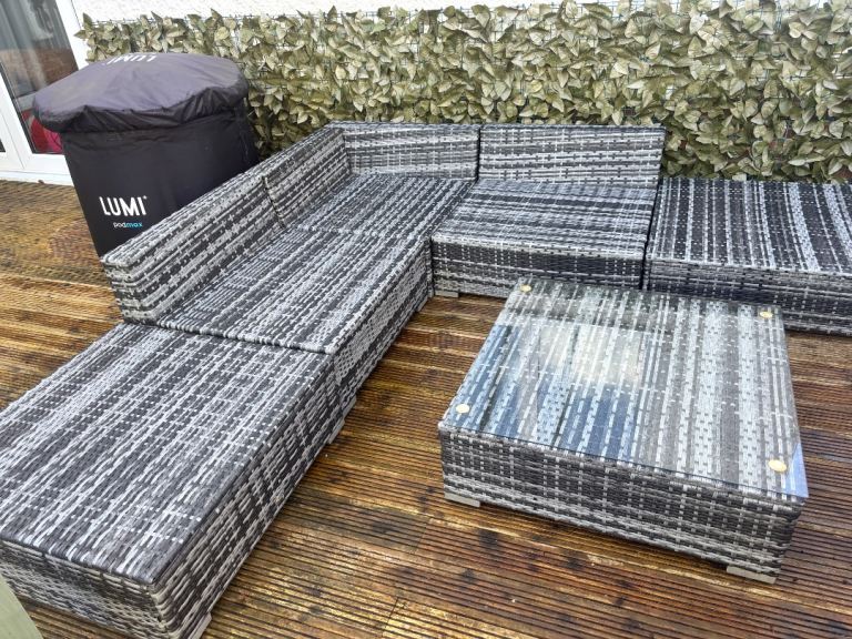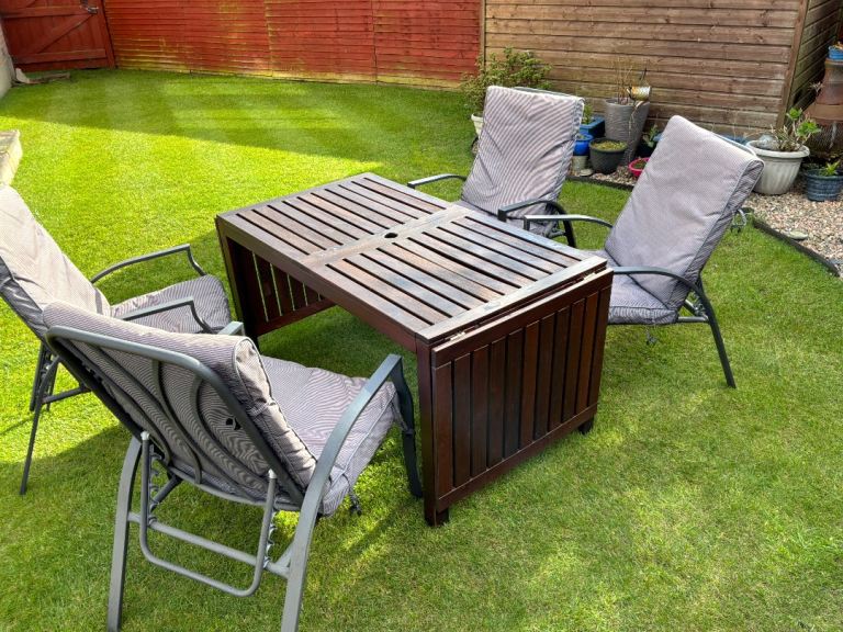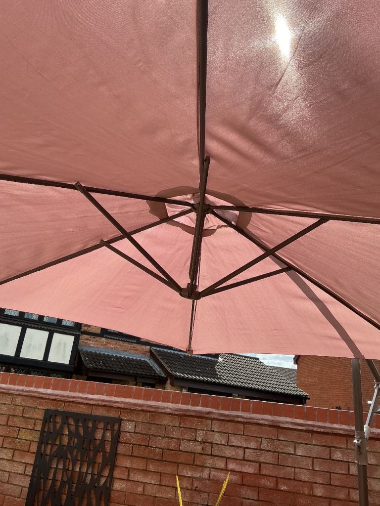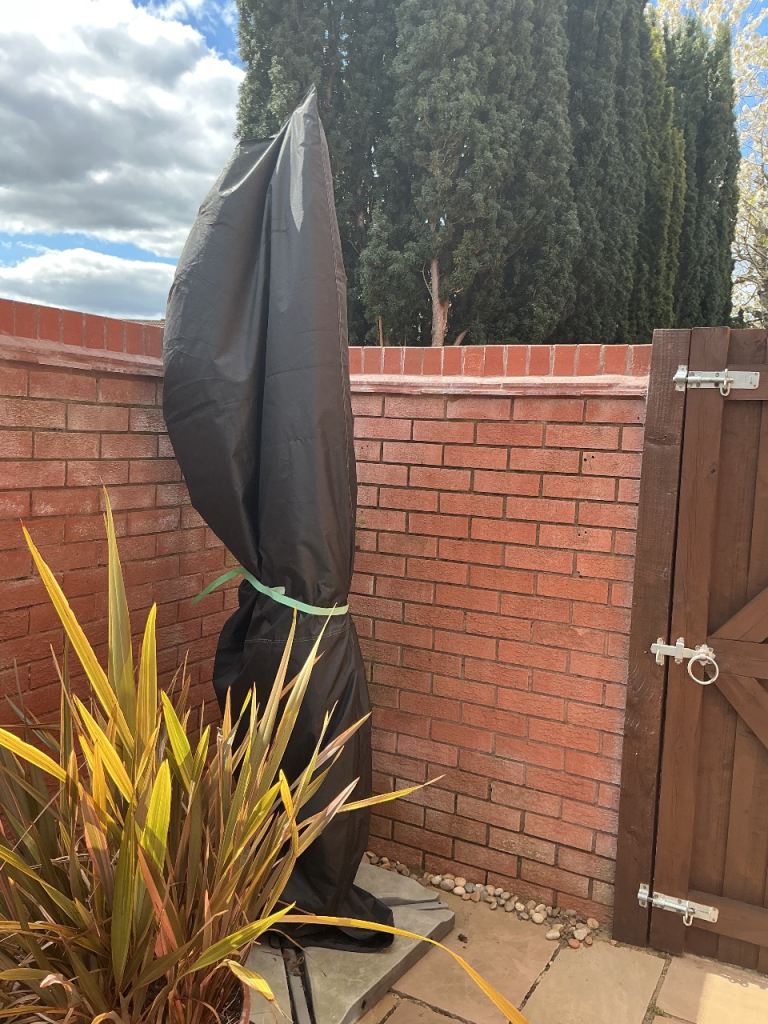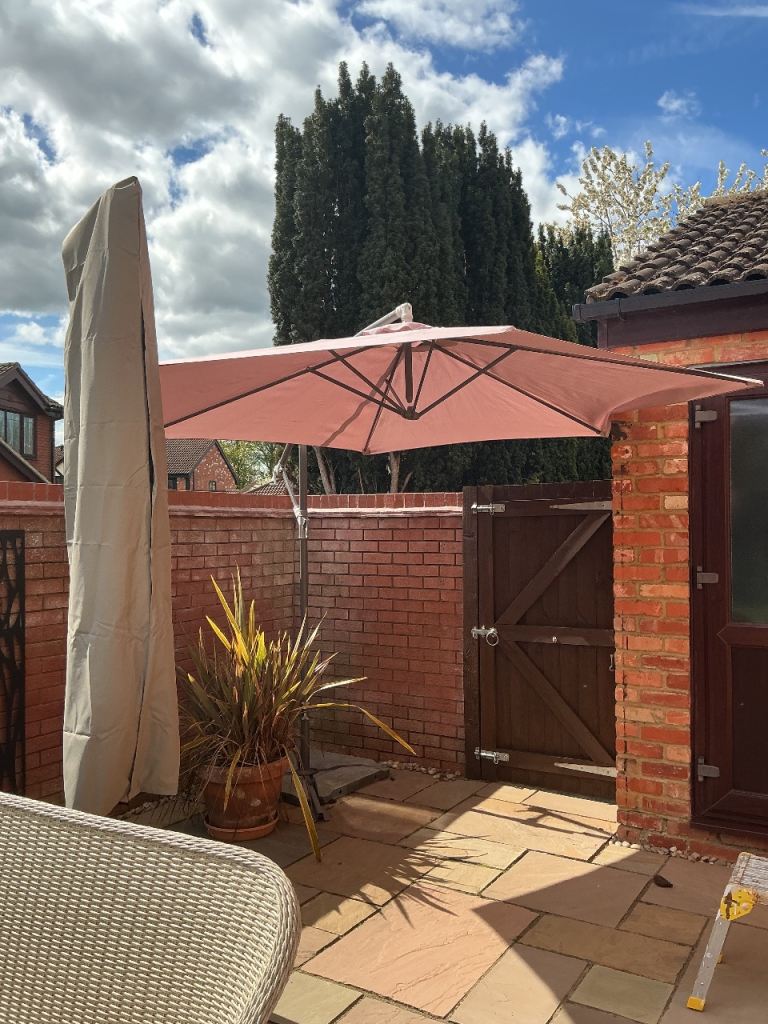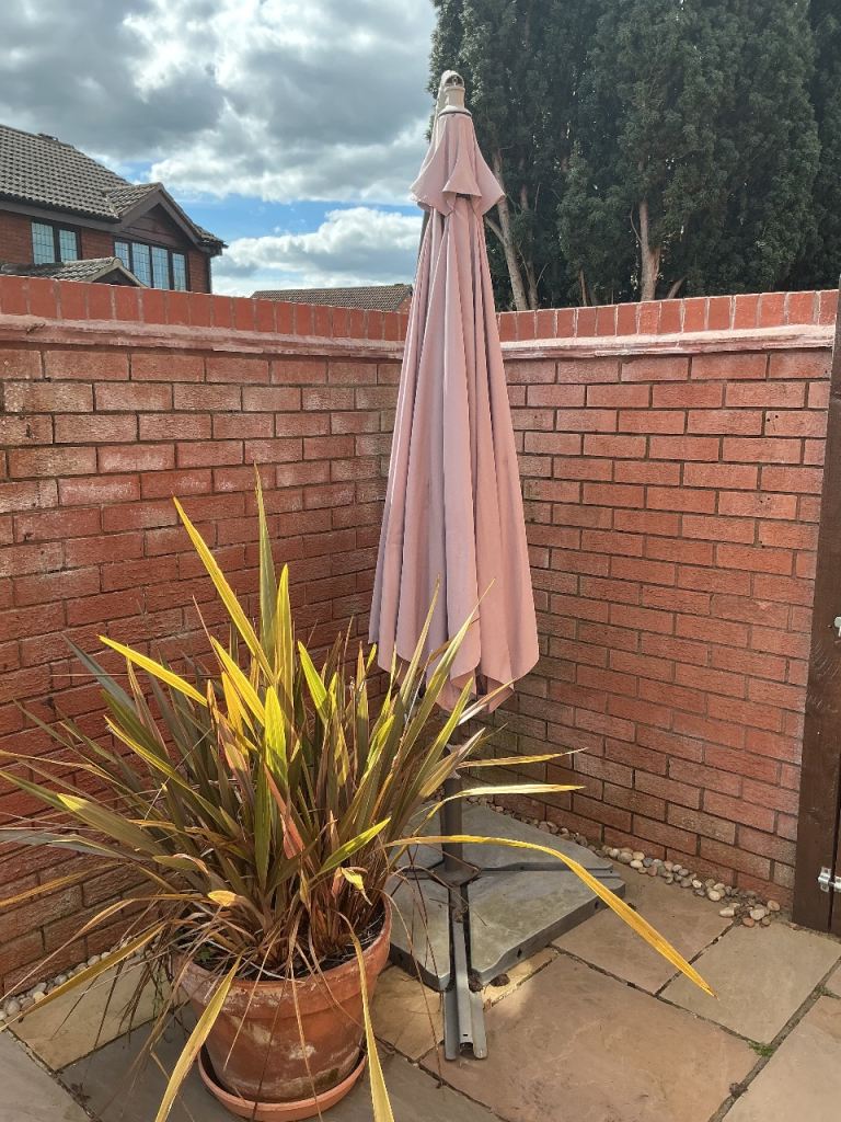 Beige/sand coloured material garden parasol for sale including plastic cover and 4 plastic covered concrete weights. Diameter when open approx 2.7 metres. Collection only.
