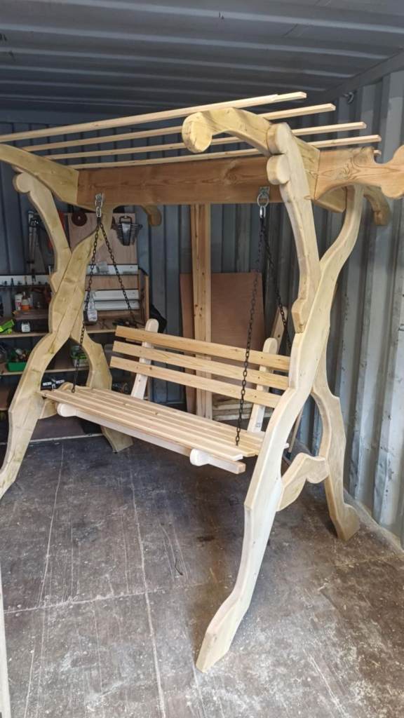 Beautiful handcrafted wooden garden swing made from solid natural timber. Strong, stable frame with decorative curved design and roof-style top beams for shade. Comfortable bench seat with smooth wooden slats, suspended with durable metal chains. Perfect for gardens, yards, patios, and outdoor relaxation. Ideal for 2–3 people. Weather-resistant and built for long-lasting outdoor use.