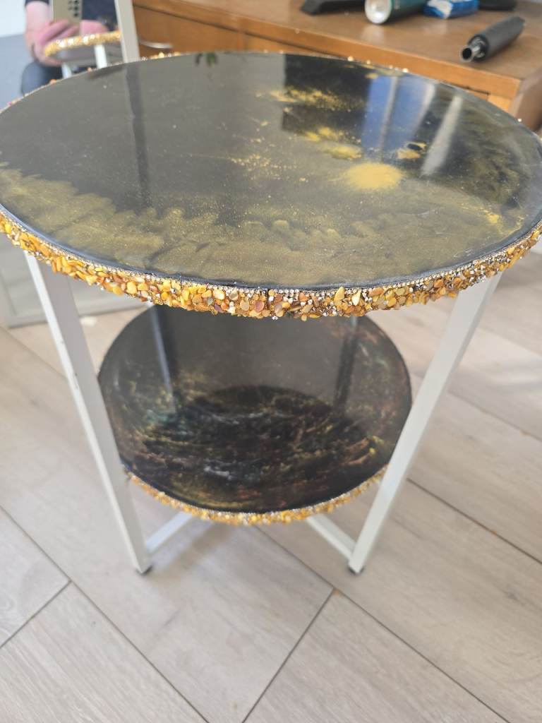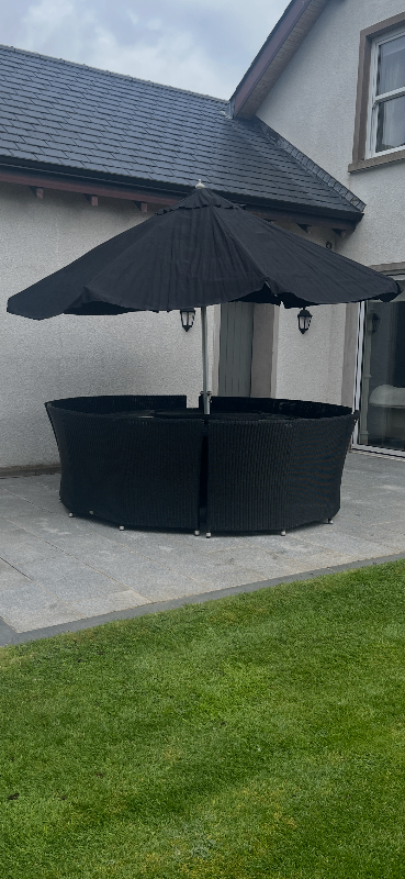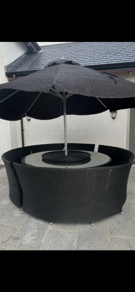 Large round Bramblecrest table 1.8m diameter. Glass top. 4 seats that seats 12 people comfortably. In good condition