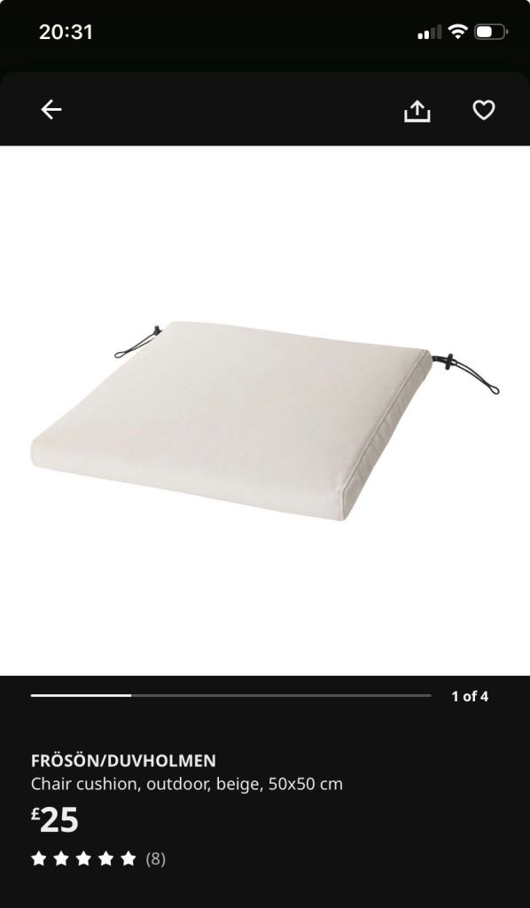 Bought last summer, great condition. Advert is one of rhe pics shows £25 each; these are £40 for all 4. They’re 50cm square and easy to wash.
