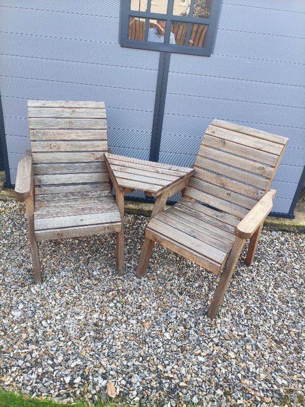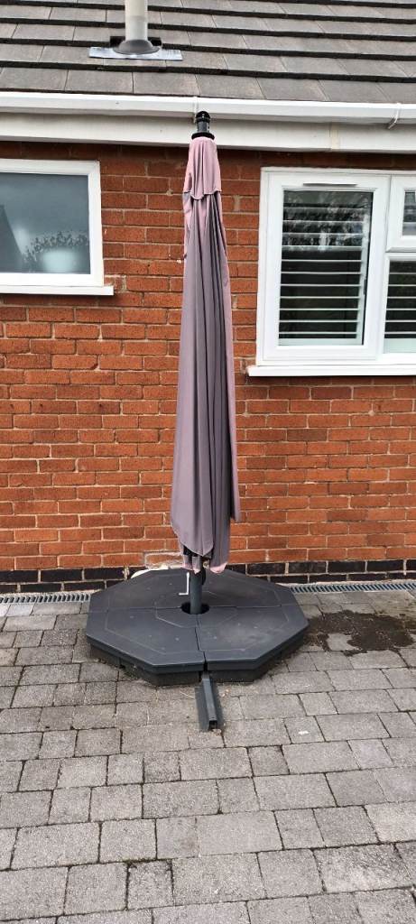 A large canterlever garden parasol and base. The parasol is 3.5 meters in diameter open and 2.6 meters high. The base is in four interlocking parts totaling one meter across. The base is hollow and can be filled with water or sand to give it weight.