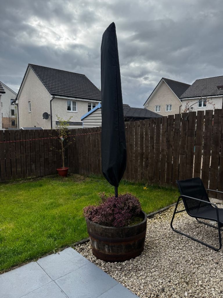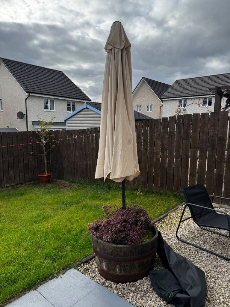 Posting for 12+ yearsLarge Garden Parasol with Base and Cover – Good Condition