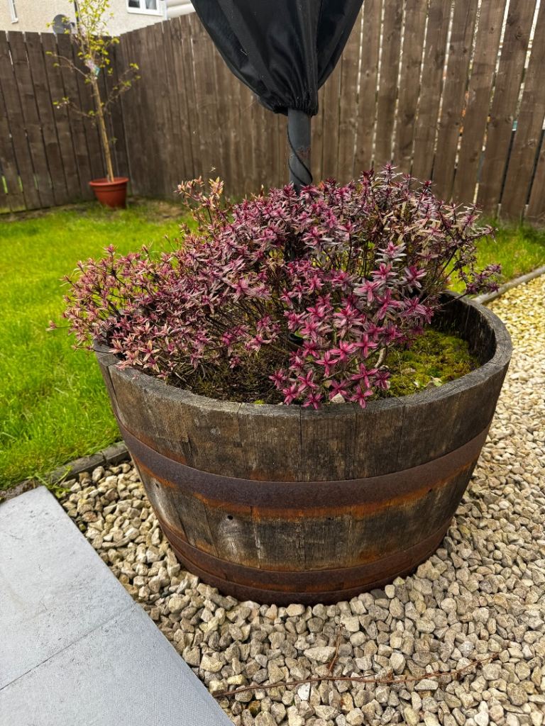 Large garden parasol with heavy barrel planter base to keep it stable. Shrubs/ plants growing in planter. Some rusting around planter.