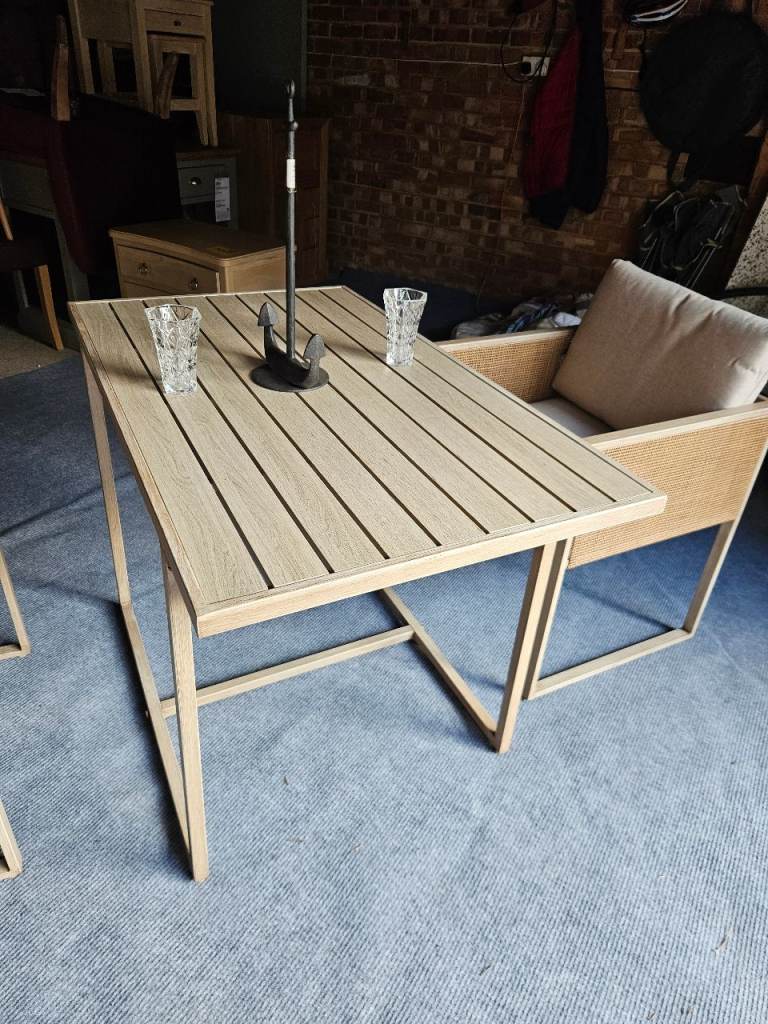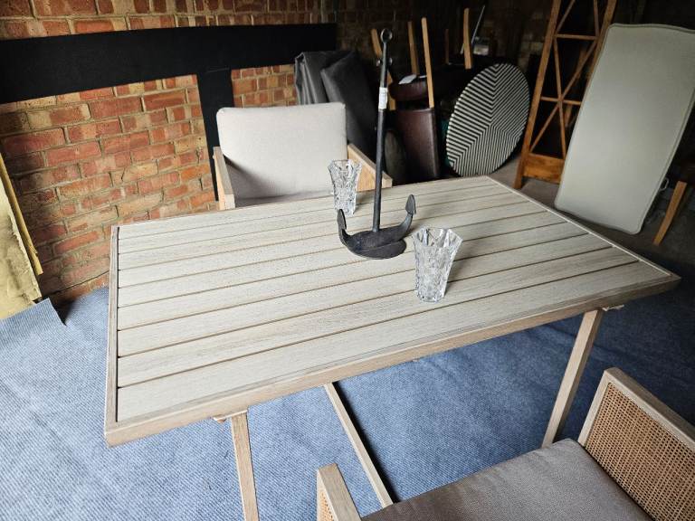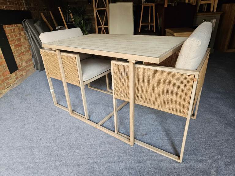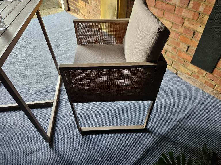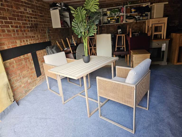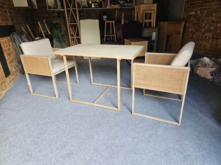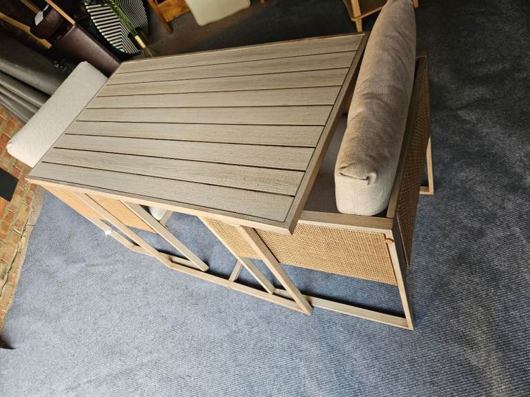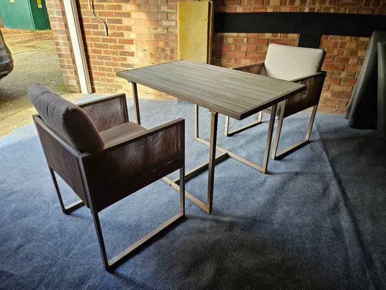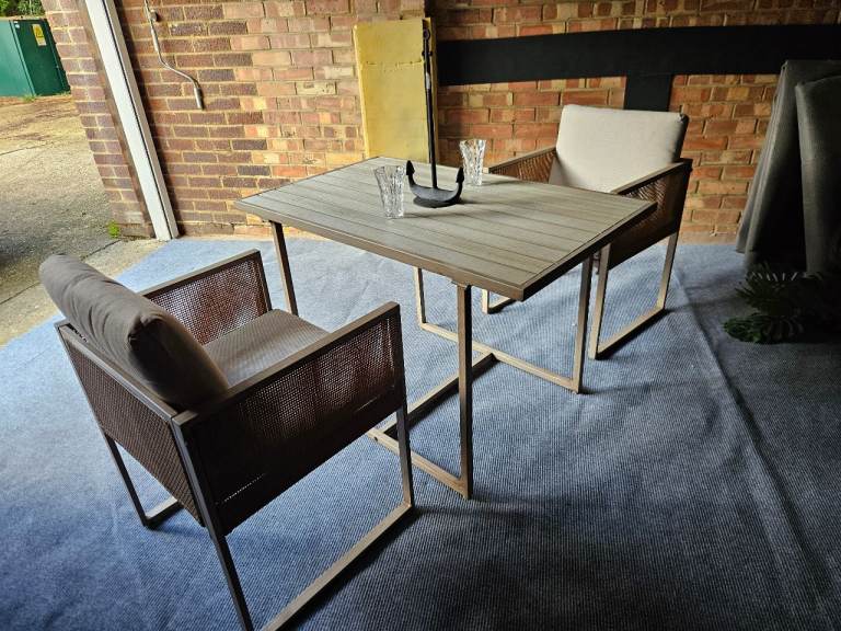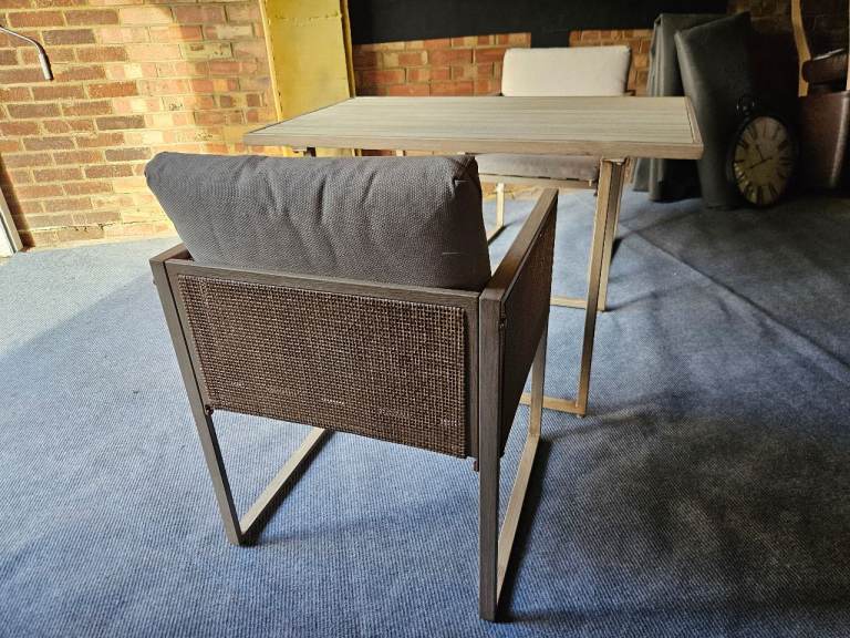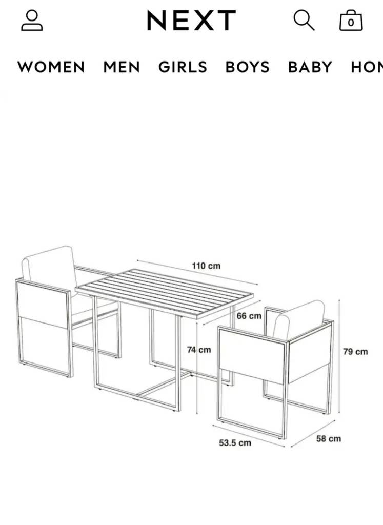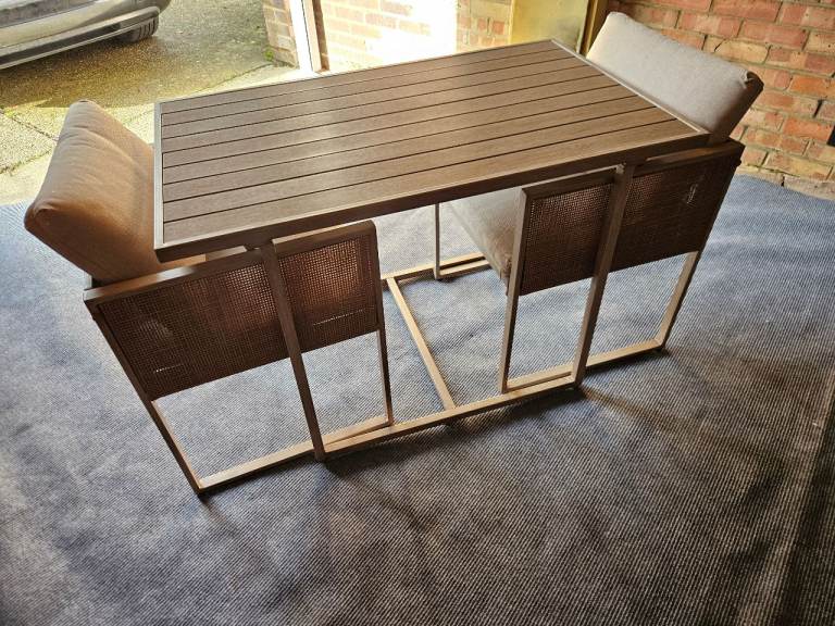 Originally from the NEXT this garden table and chair set designed with compact chairs that slide perfectly underneath the table and cushions that are easily removed when it is not in use, this set comes with two matching seats.