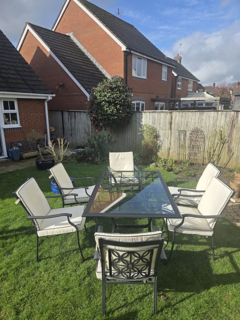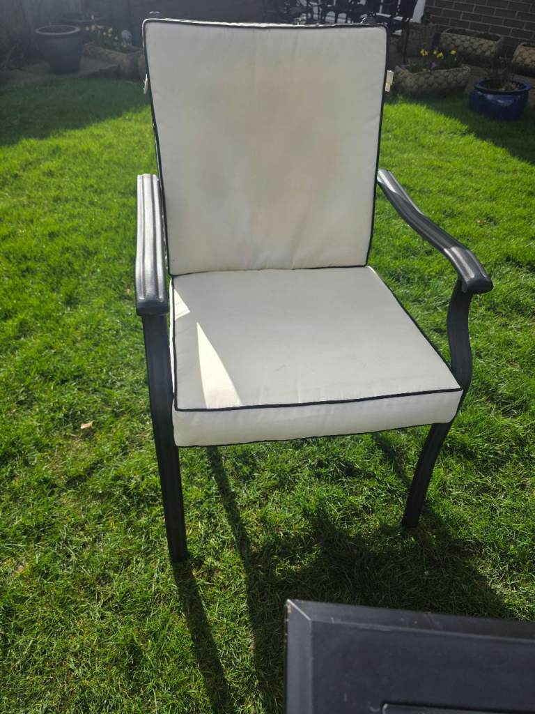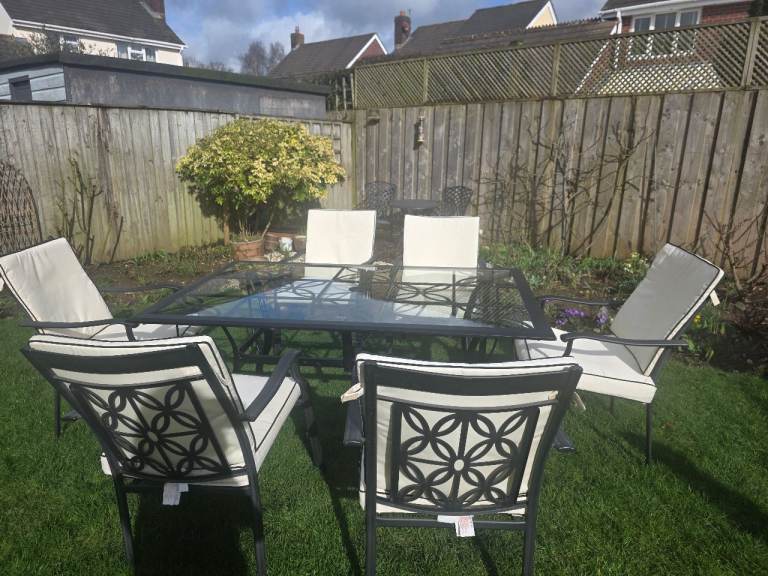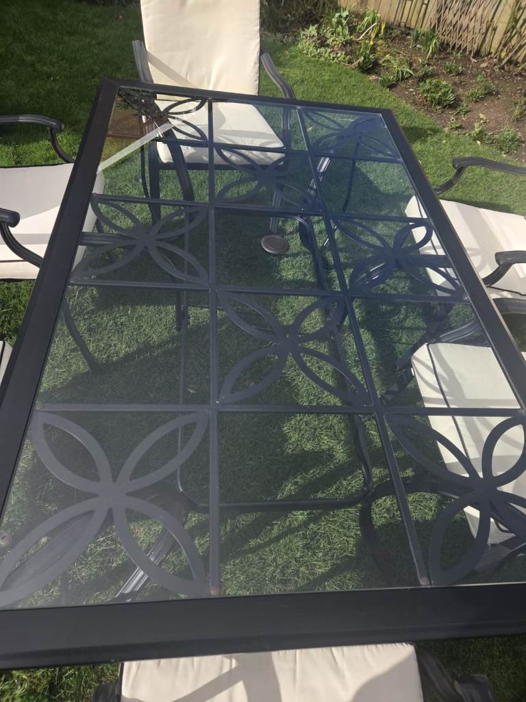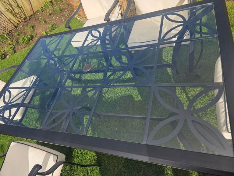 Black ornate garden table with glasstop. 6 ornate chairs with arms and cream cushions. Centre hole in glass top for parasol. In very good conditon 2 years old, been stired indoors in winter. Selling due to moving. Excellent condition.