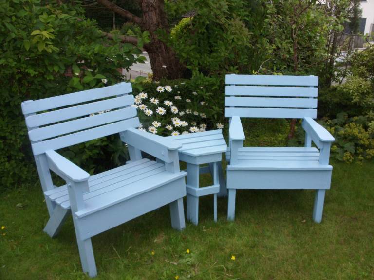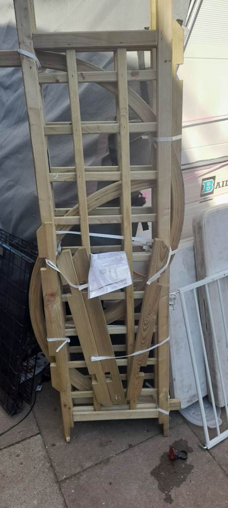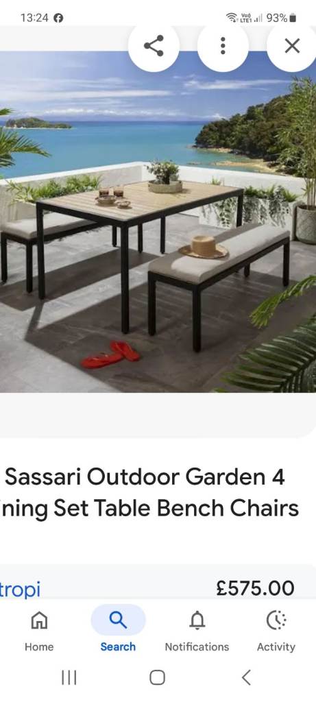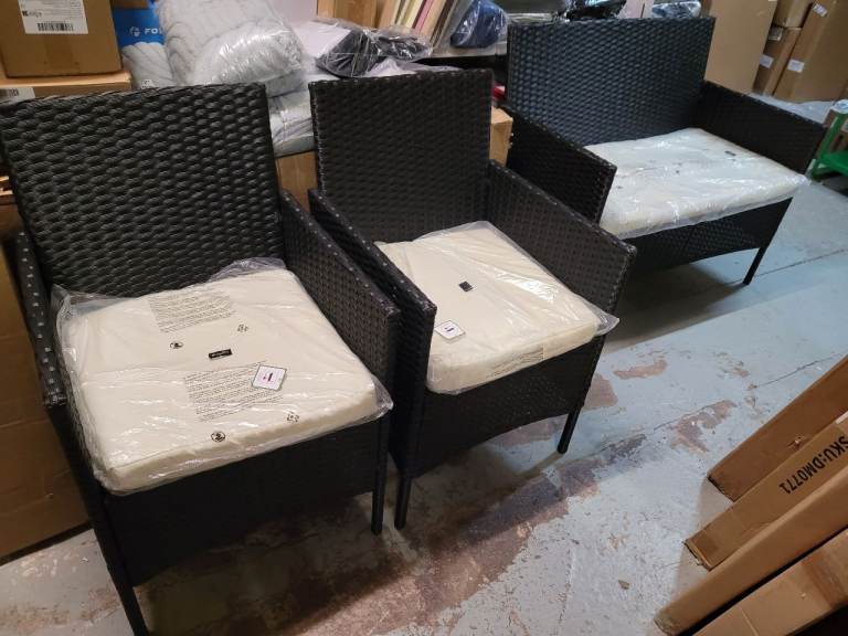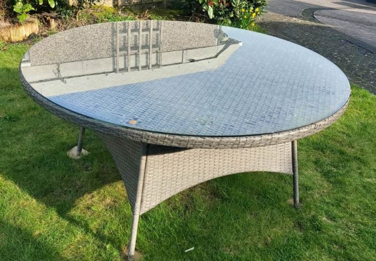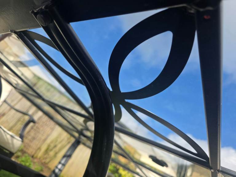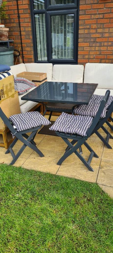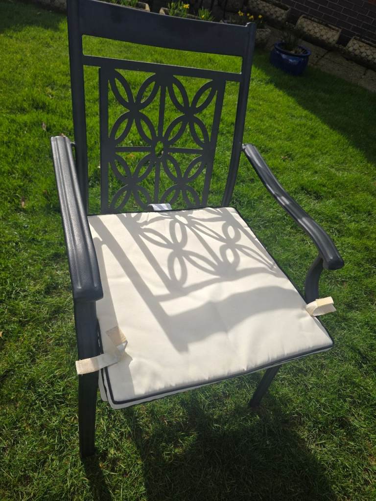 Black ornate garden table with glasstop. 6 ornate chairs with arms and cream cushions. Centre hole in glass top for parasol. In very good conditon 2 years old, been stired indoors in winter. Selling due to moving. Excellent condition.