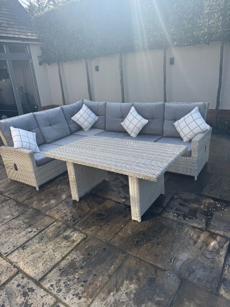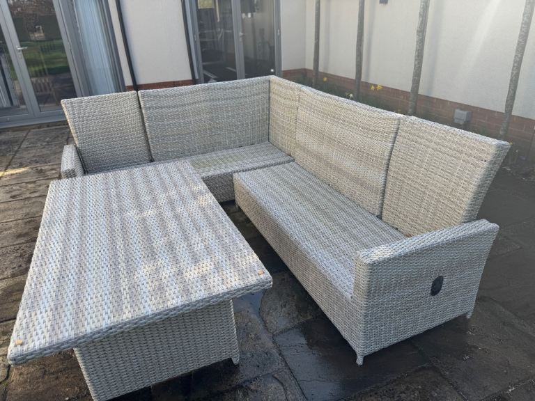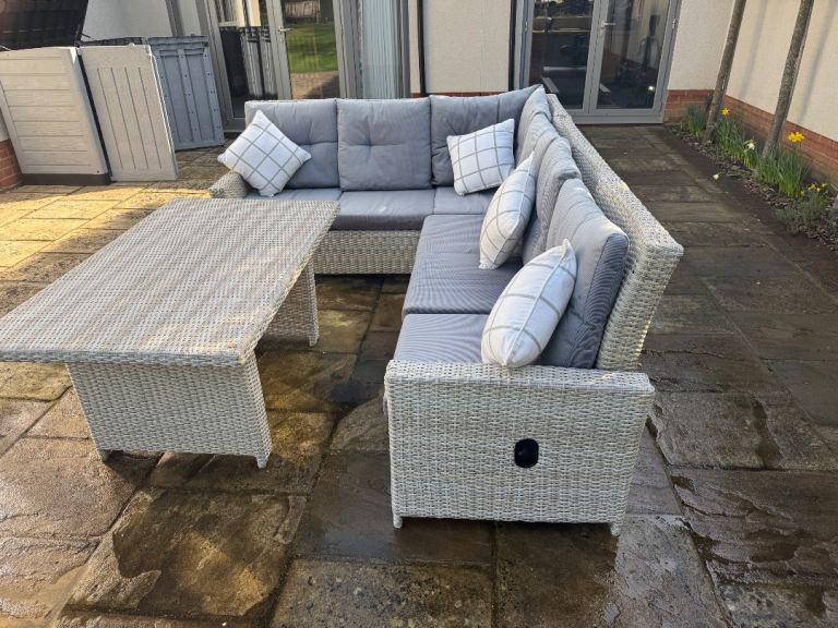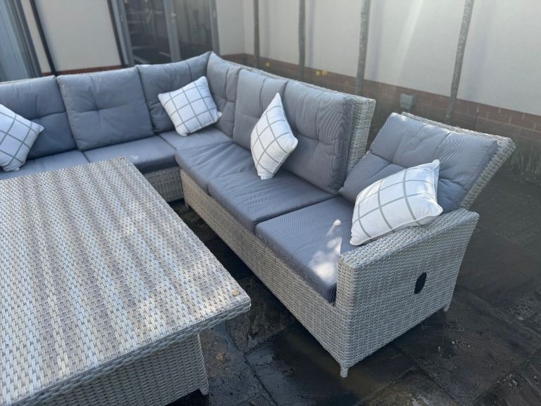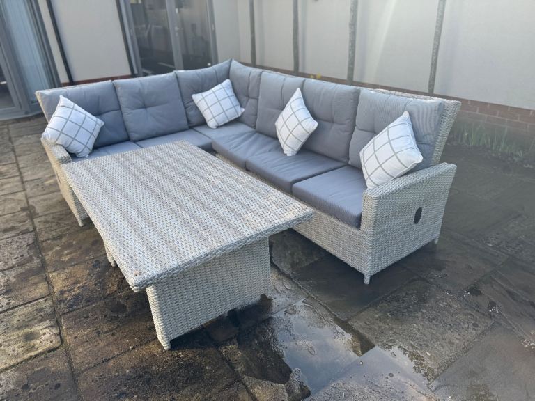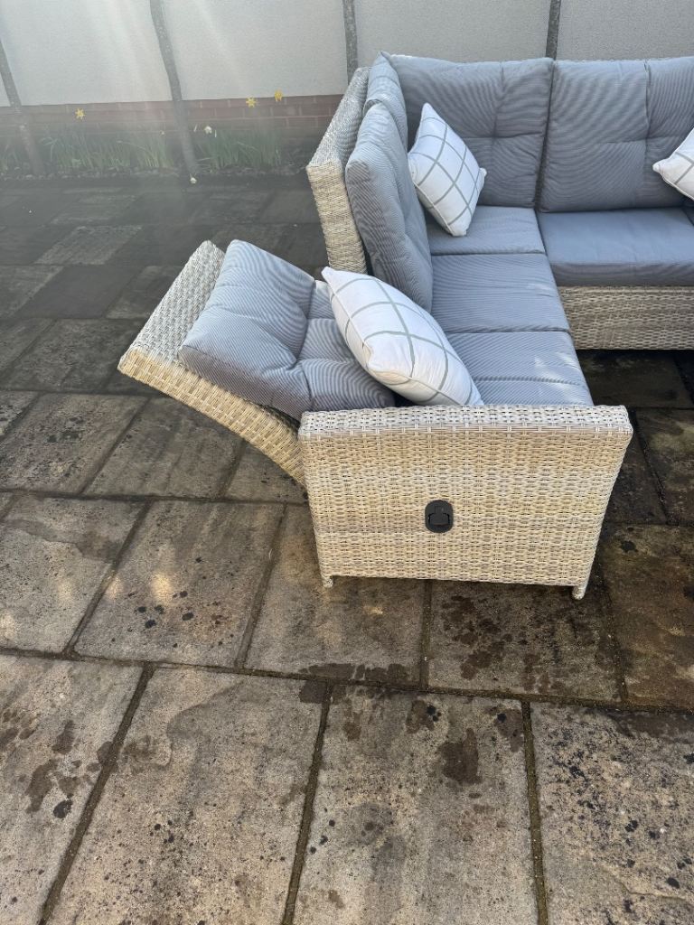 Two piece reclining outdoor setting sits 5/6 including table and cushions for sale - owner down sizing otherwise it would not be sold.