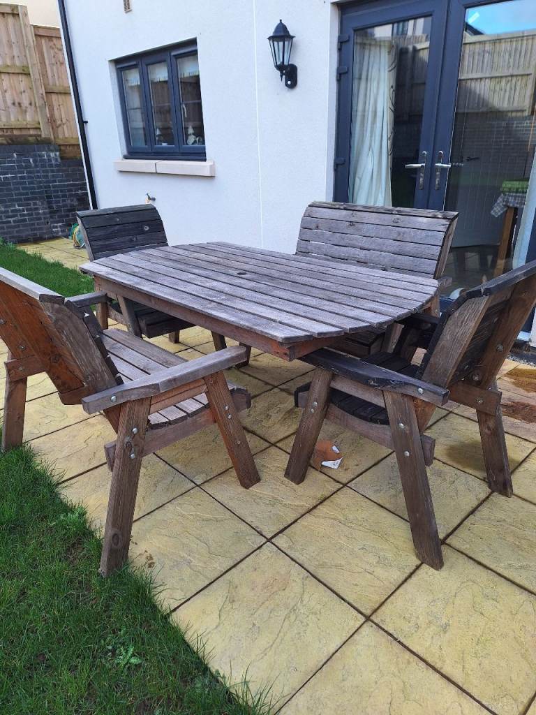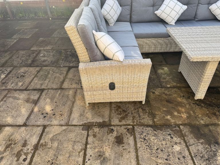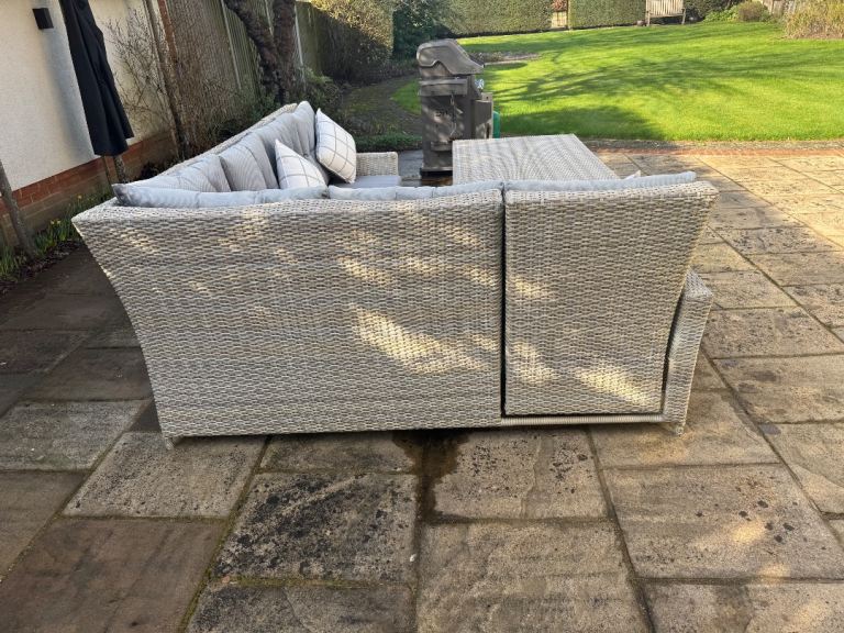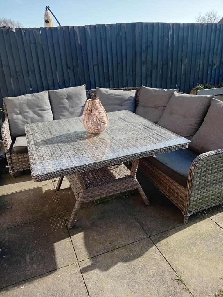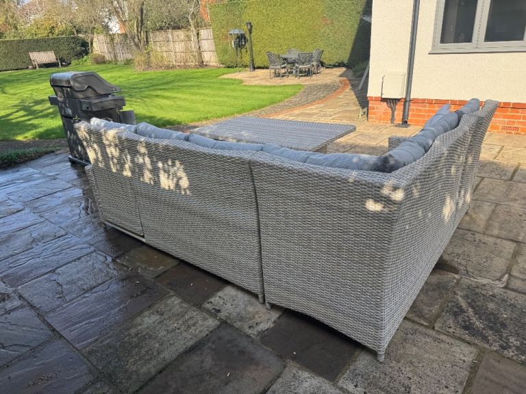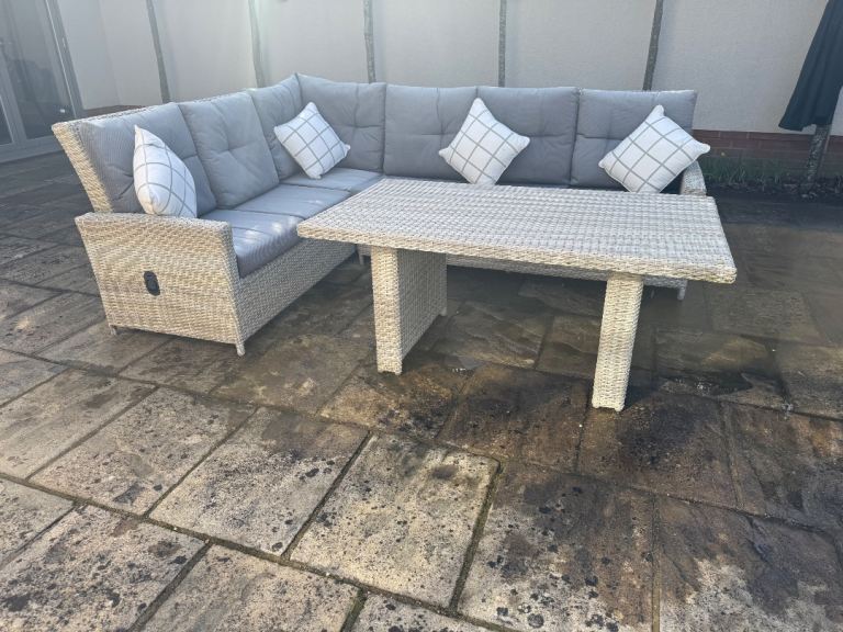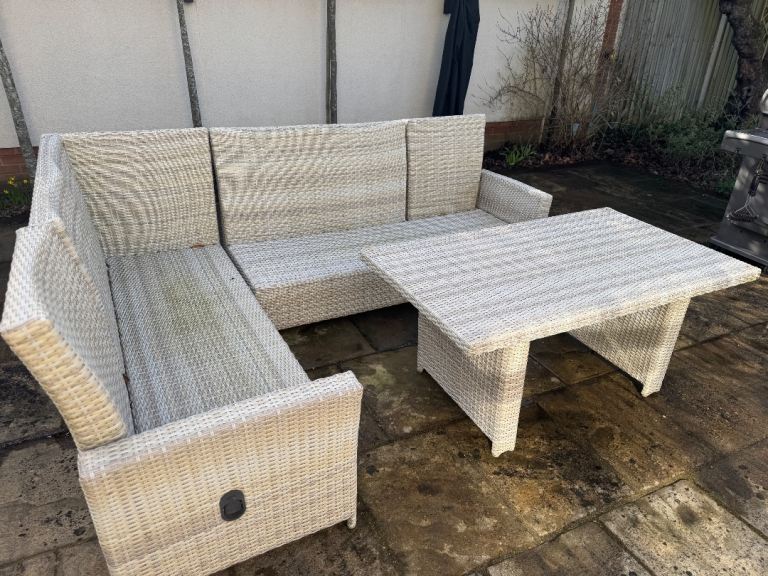 Two piece reclining outdoor setting sits 5/6 including table and cushions for sale - owner down sizing otherwise it would not be sold.