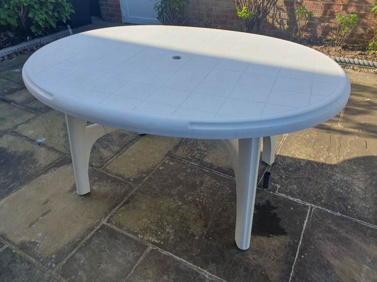 Oval Garden Table made from West Country plastic, solid construction. It can disassemble for easy transport. Size 1.5m long x 1m wide x .7m high.