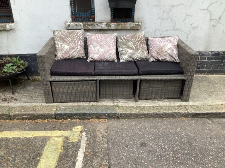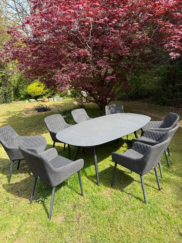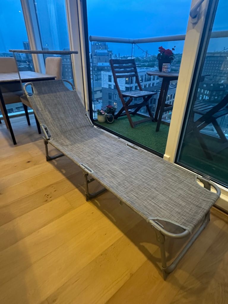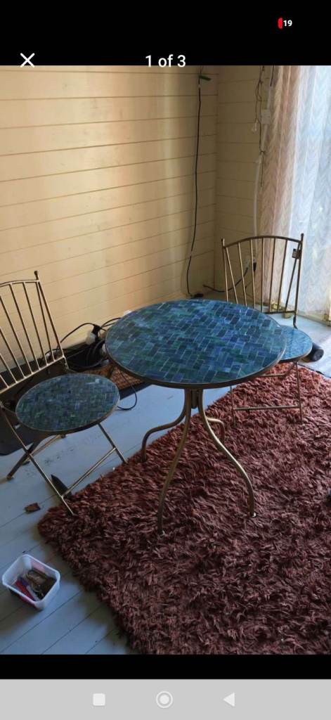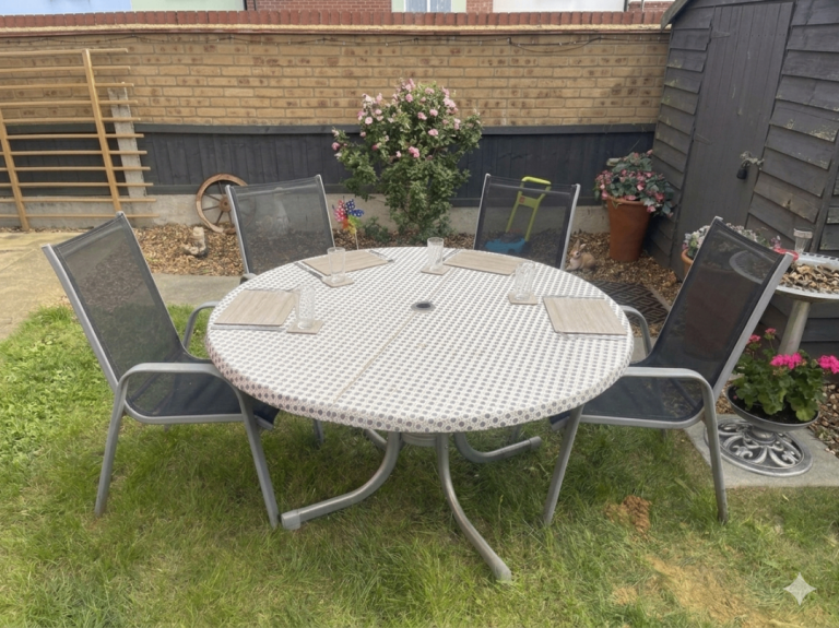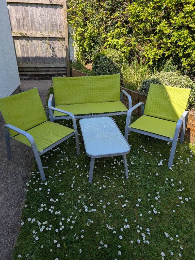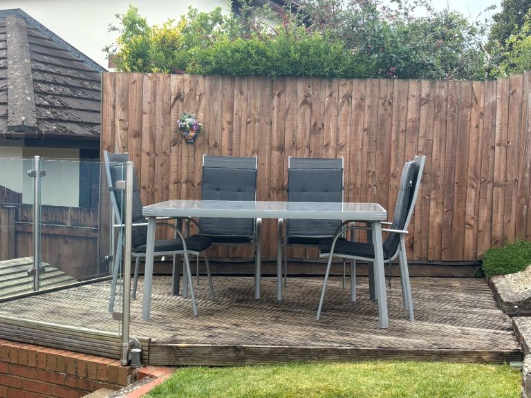 Lightweight aluminium glass topped table and 4 matching chairs.