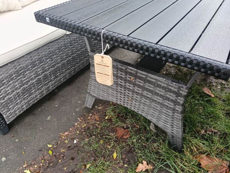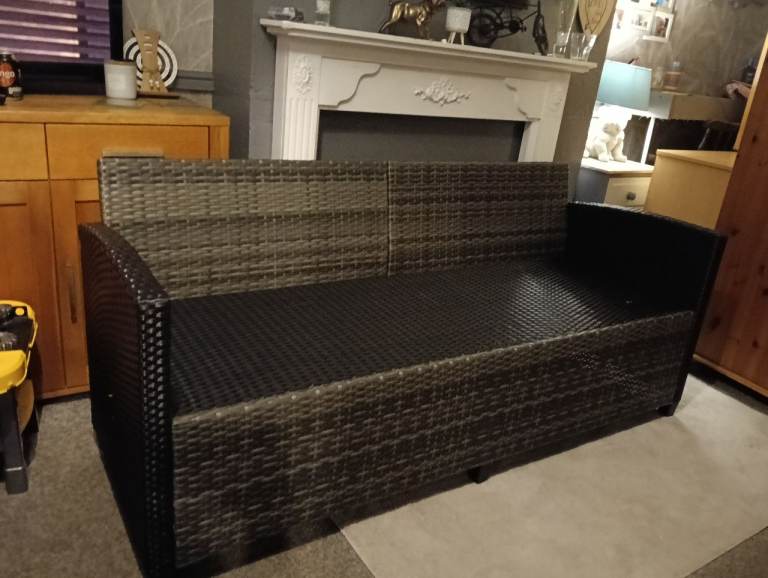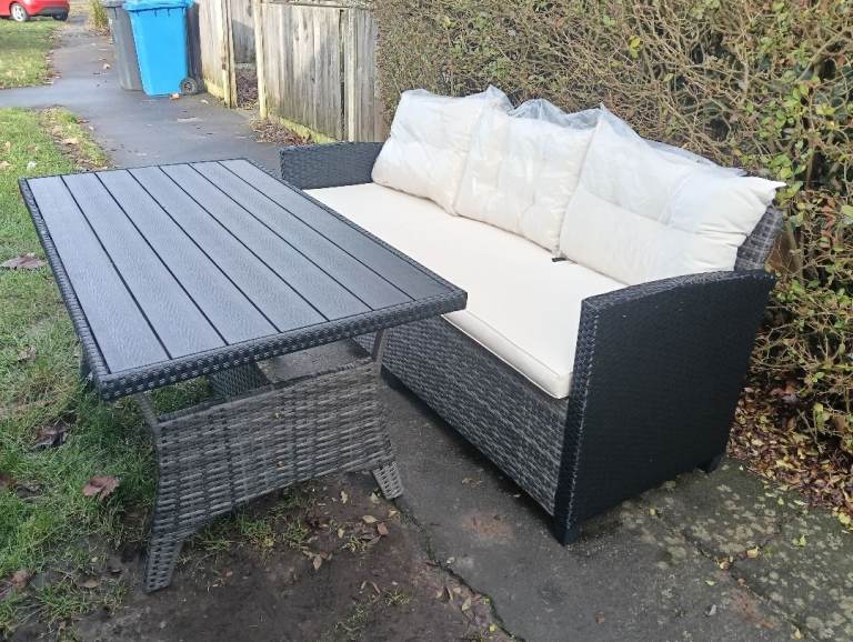 Rattan 3 seater sofa with cream cushions and matching table