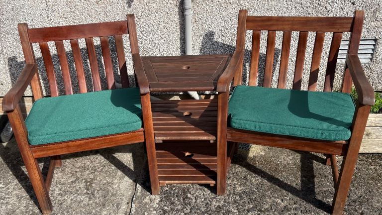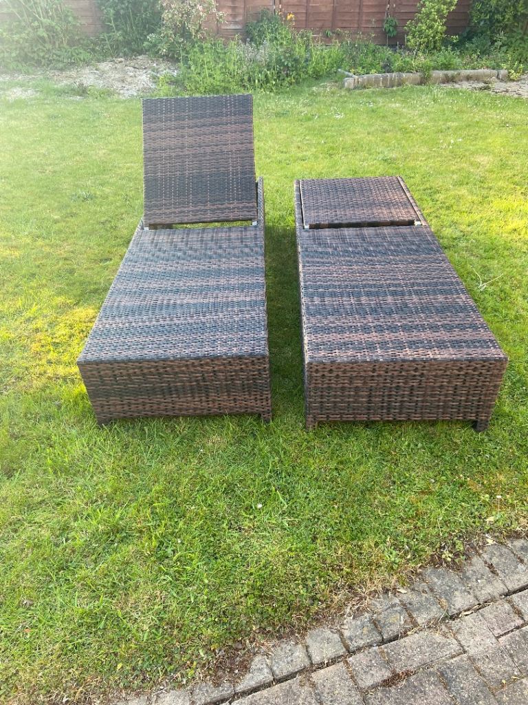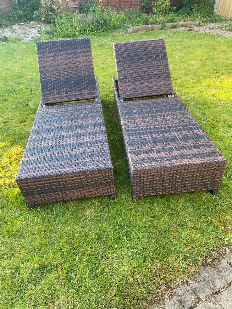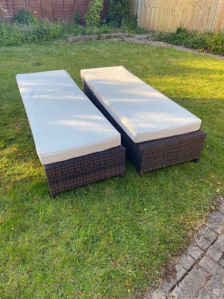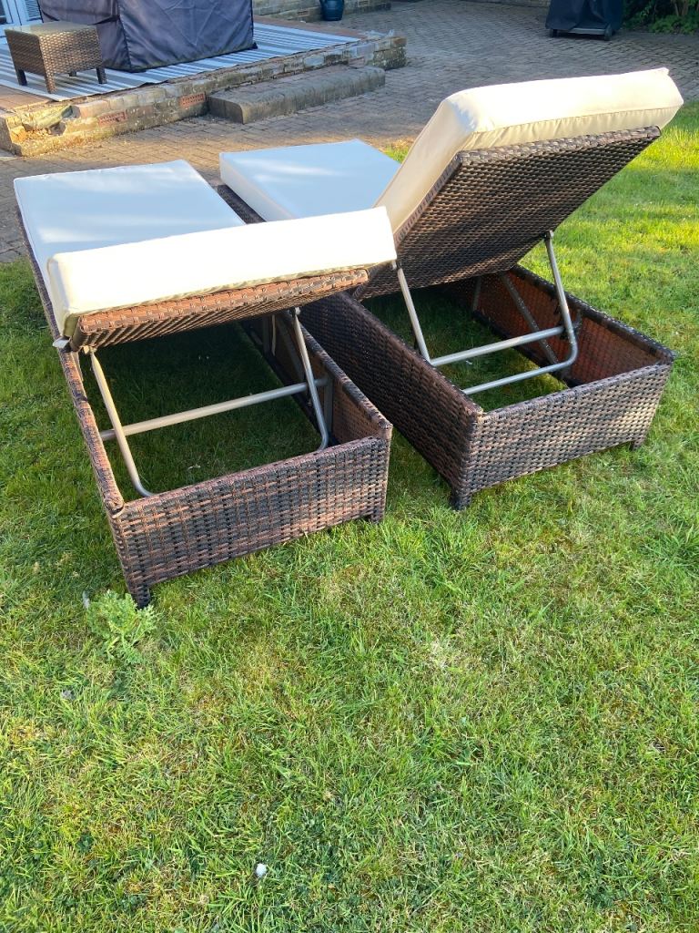 Rattan sun lounger set. 2x Brown rattan sun loungers with cream cushions. Very comfy. Good condition. Measure approximately 195cm in length, 32cm depth and 68cm width. Collection from Bursledon.