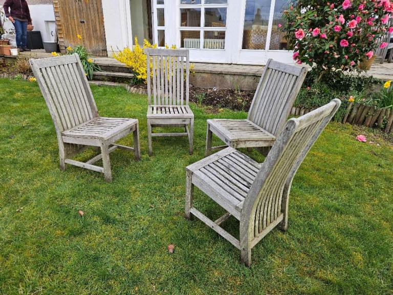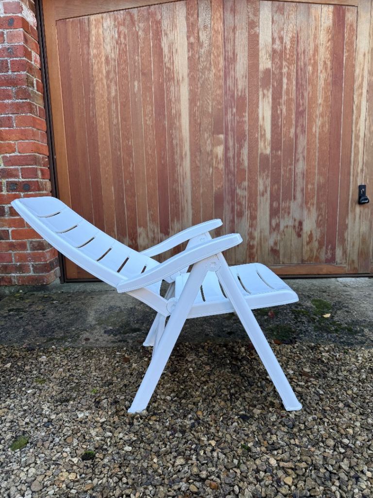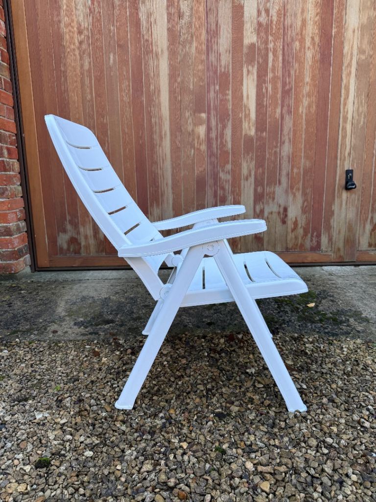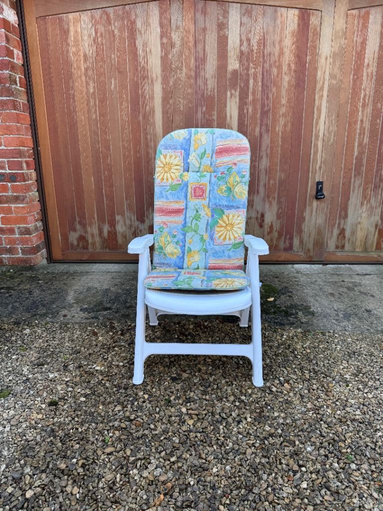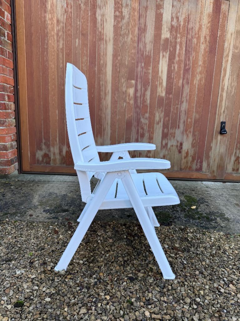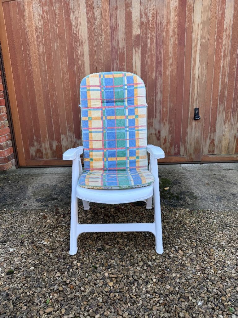 4 reclining plastic chairs ideal for garden patio or camping. Includes reversible cushion covers. Excellent quality very sturdy chairs.