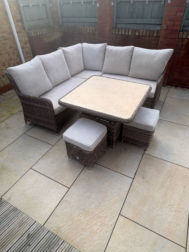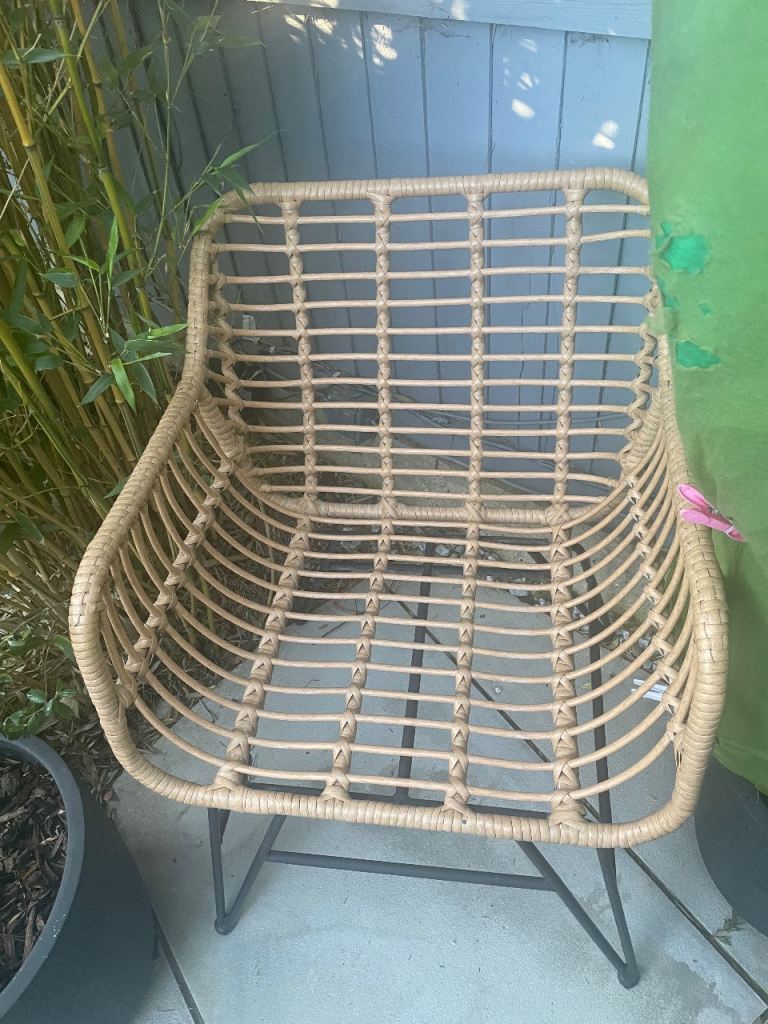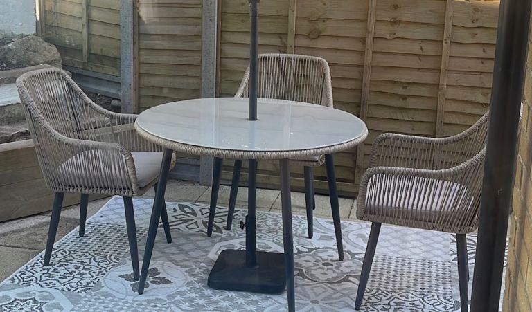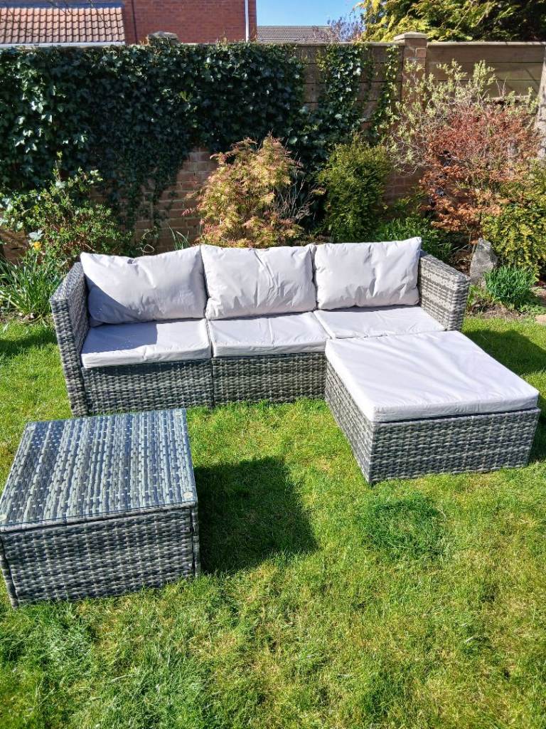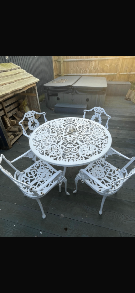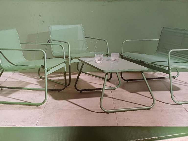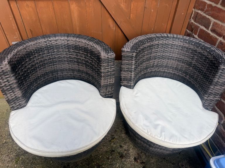 4 reclining plastic chairs ideal for garden patio or camping. Includes reversible cushion covers. Excellent quality very sturdy chairs.