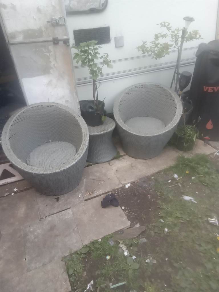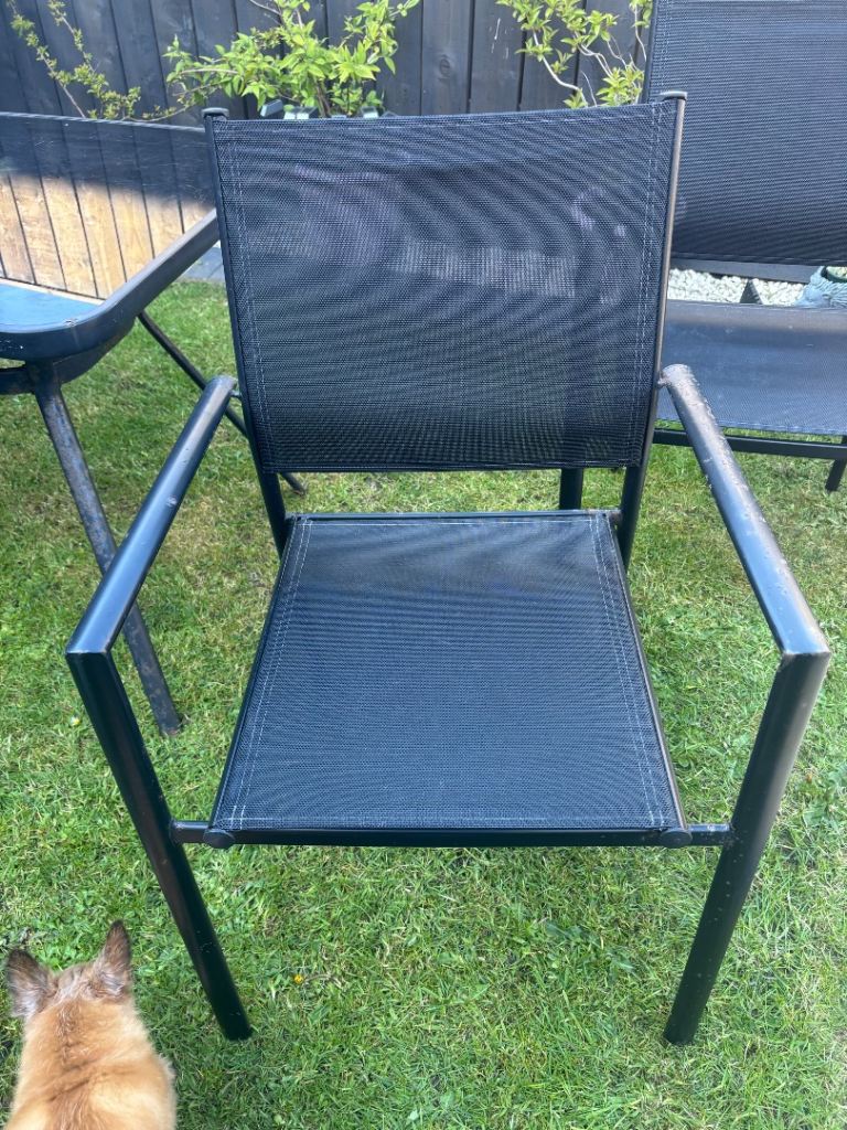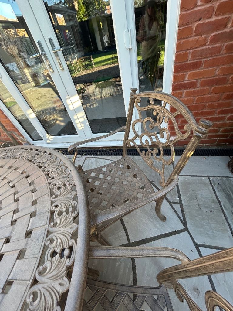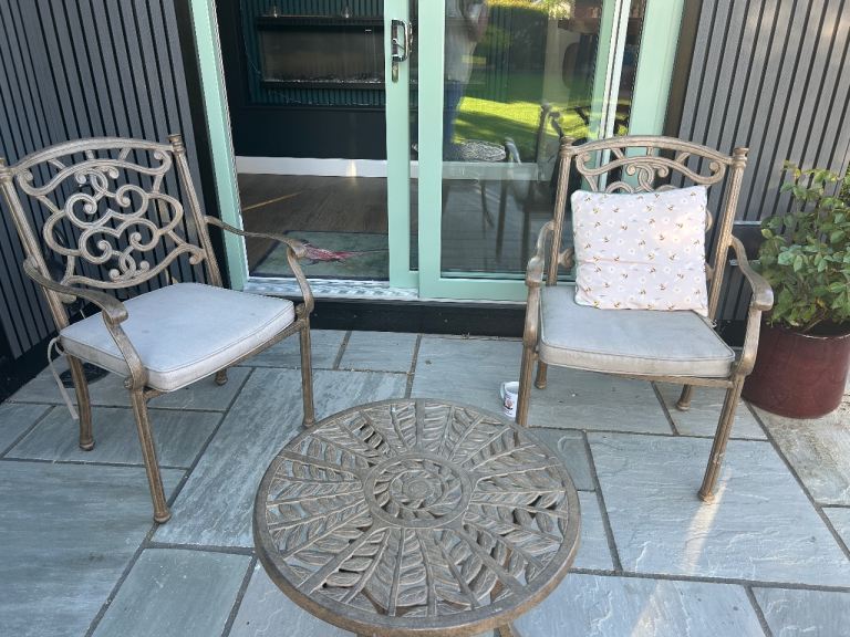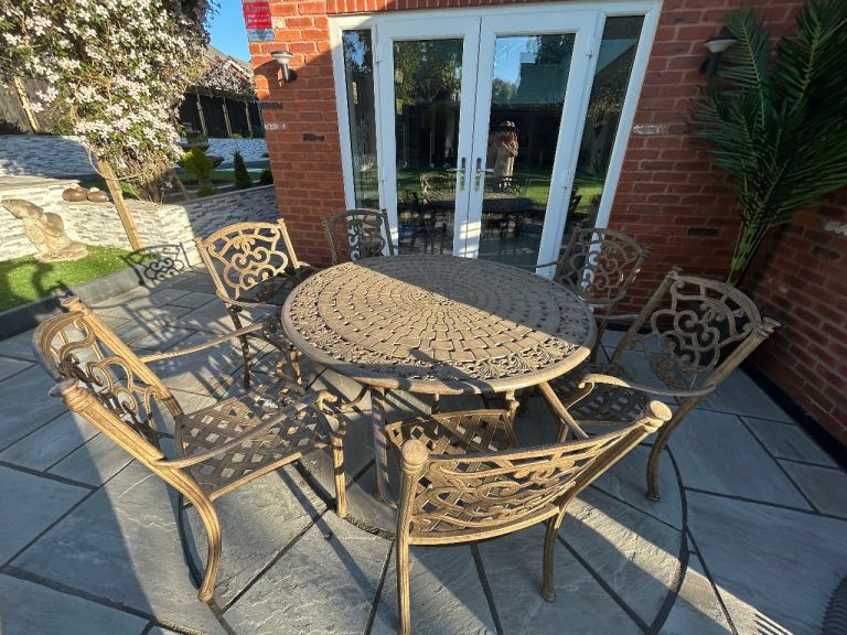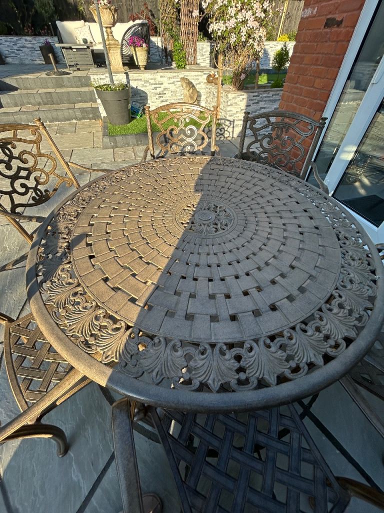 Six seater round dining outdoor table and six matching metal chairs plus matching bistro set with two chairs and matching table
