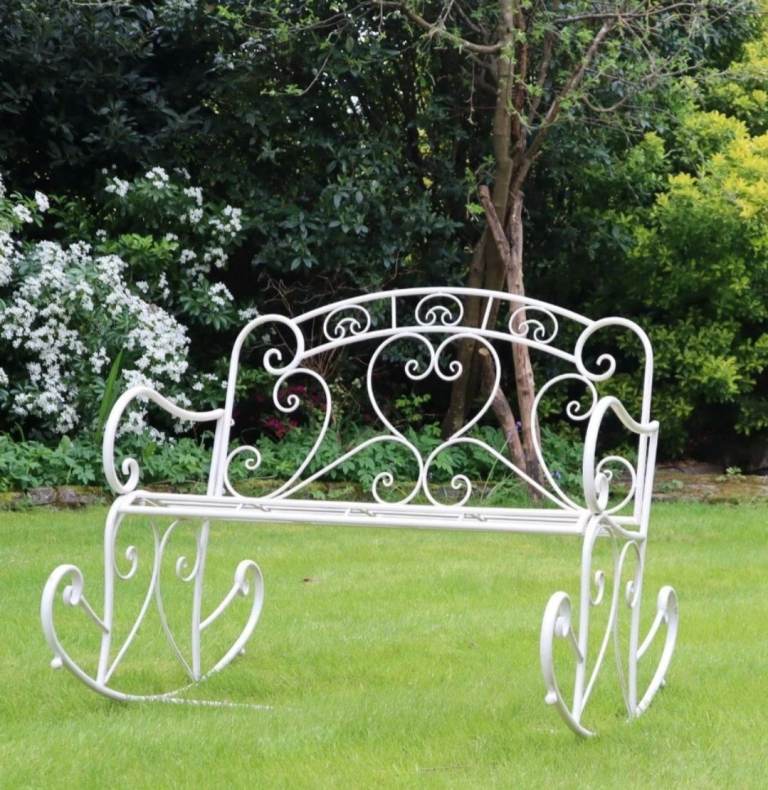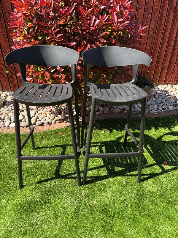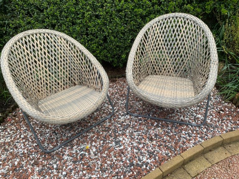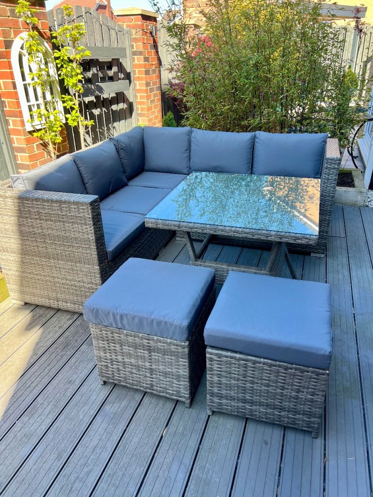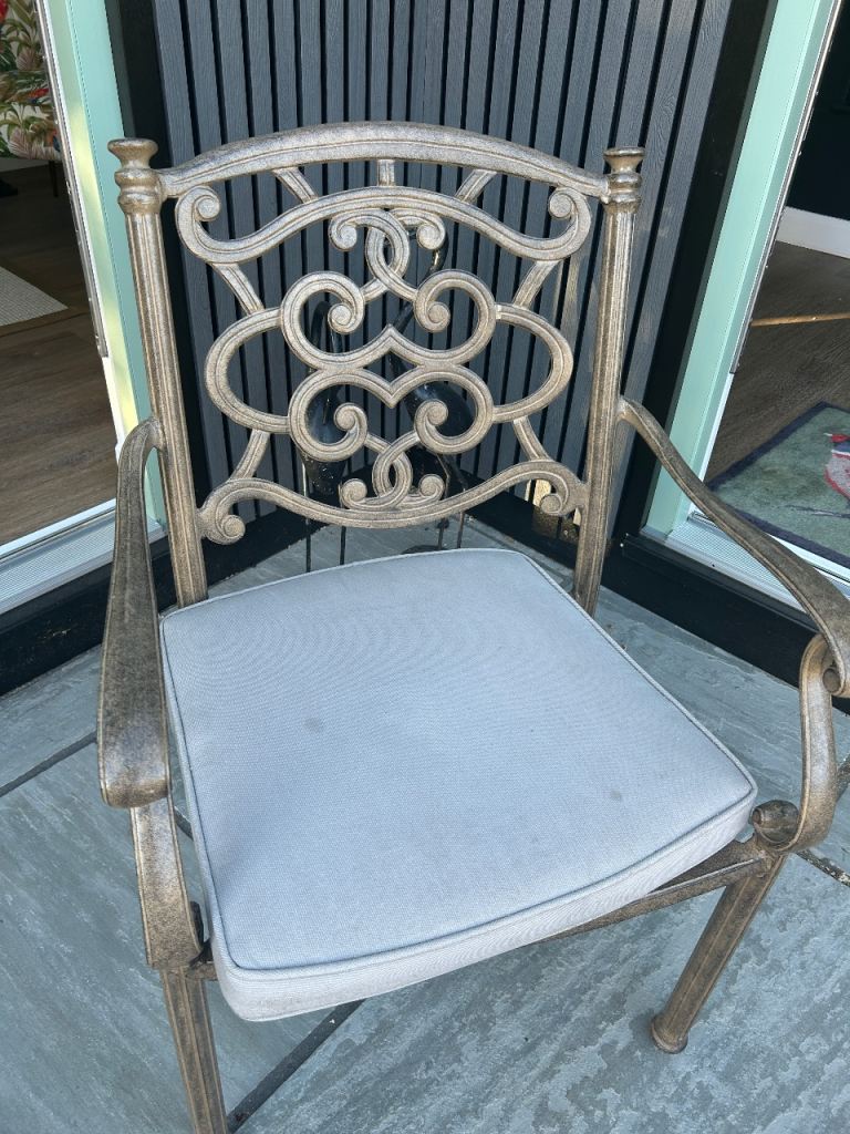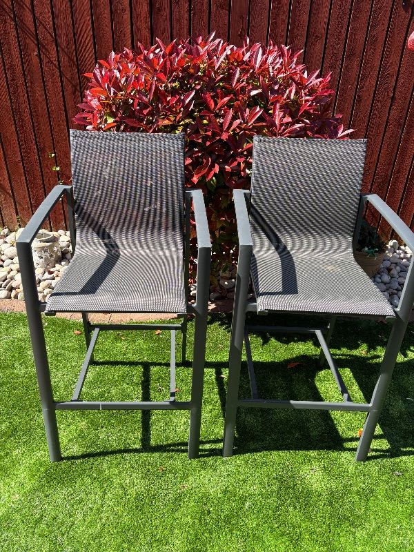 Six seater round dining outdoor table and six matching metal chairs plus matching bistro set with two chairs and matching table