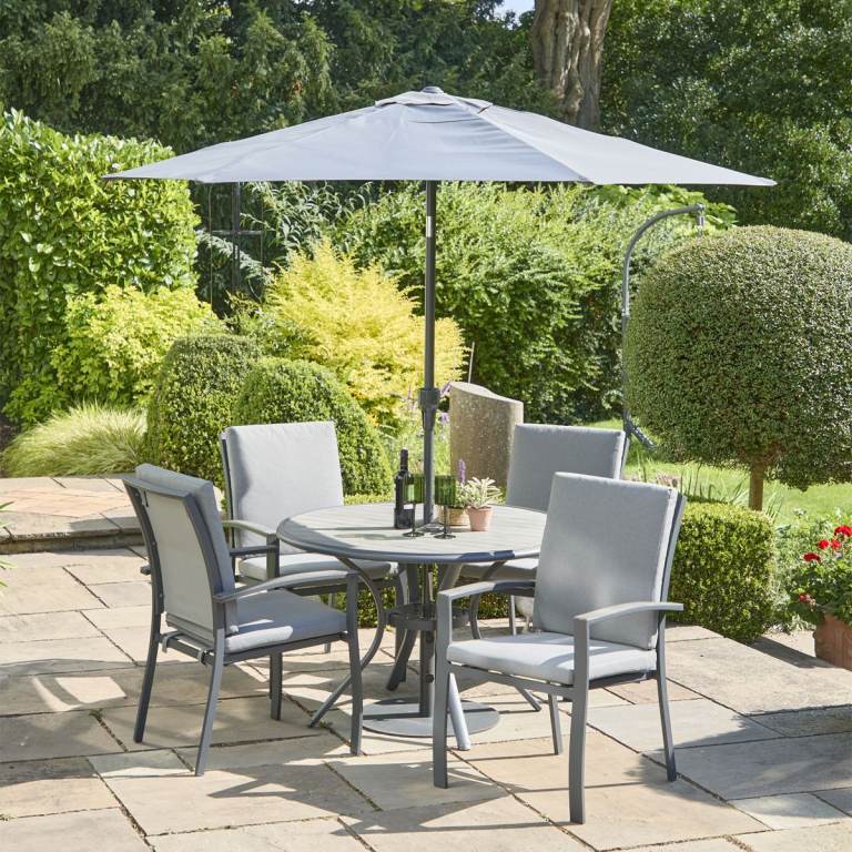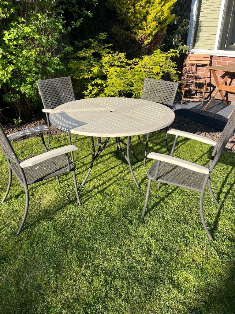 Round metal outdoor dining table with six chairs plus matching bistro set