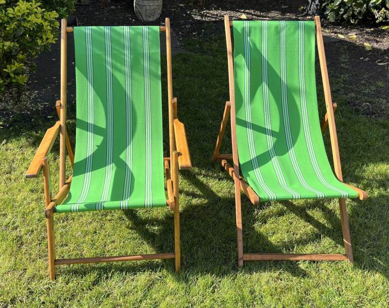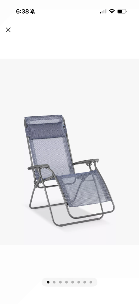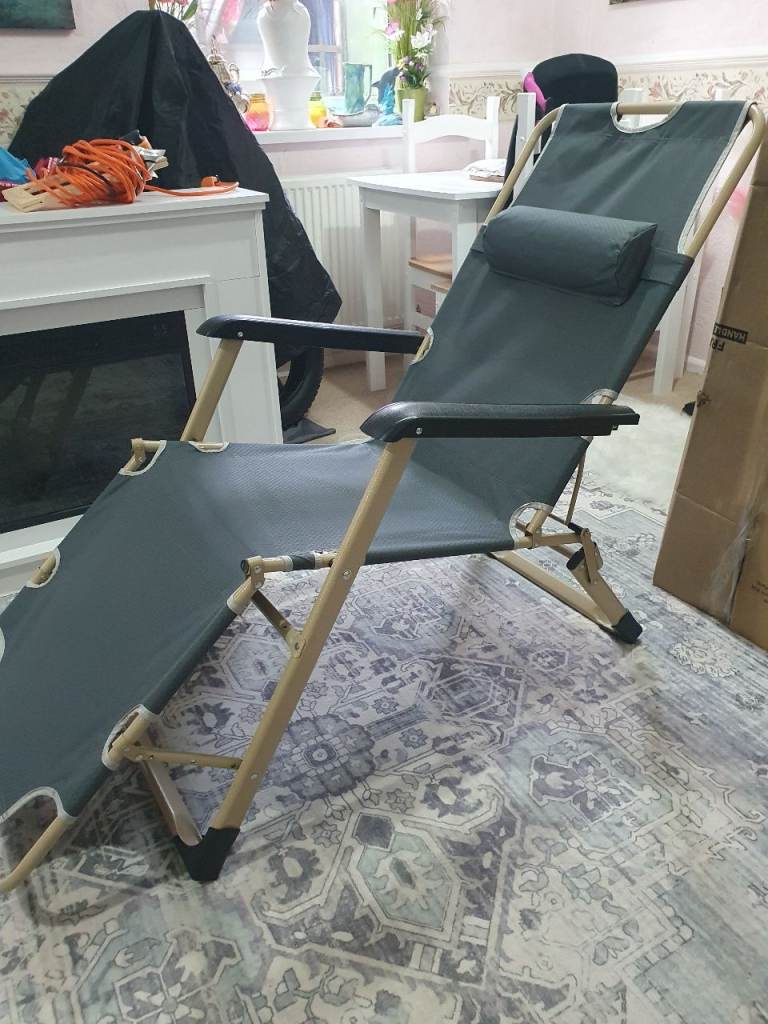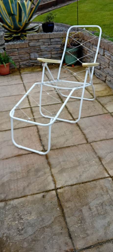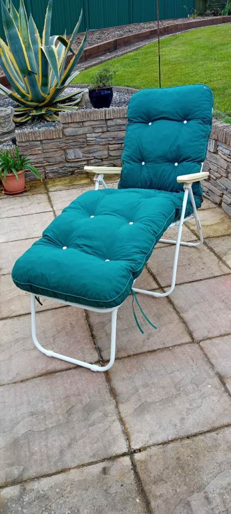 Metal frame foldable Sun lounger with adjustable sear back in white with full length padded green coushion.