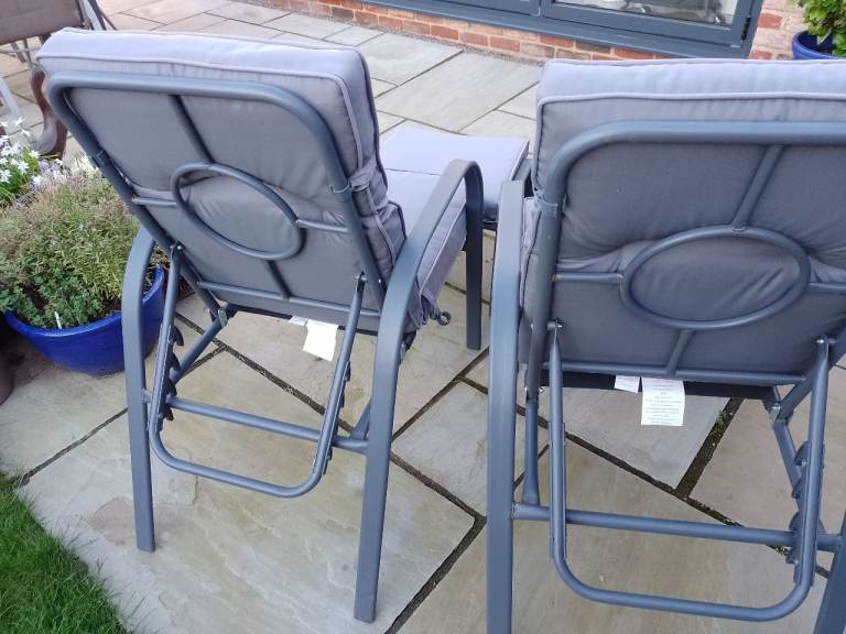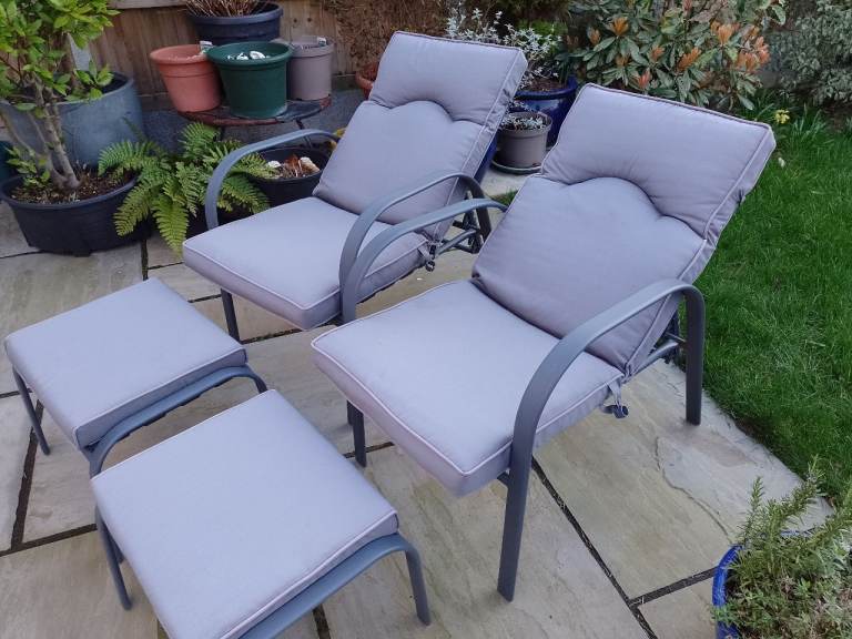 Two adjustable garden chairs and footstools with cushions. Very comfortable. Very little use. Cushions are shower proof and detachable.