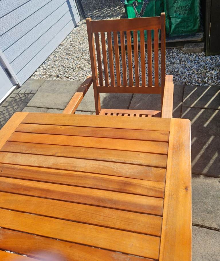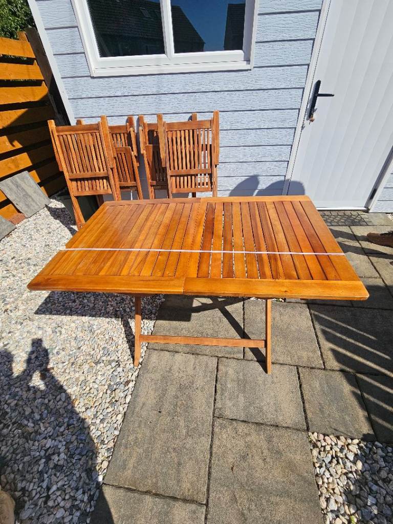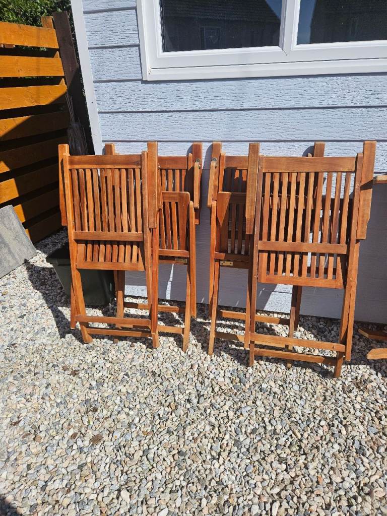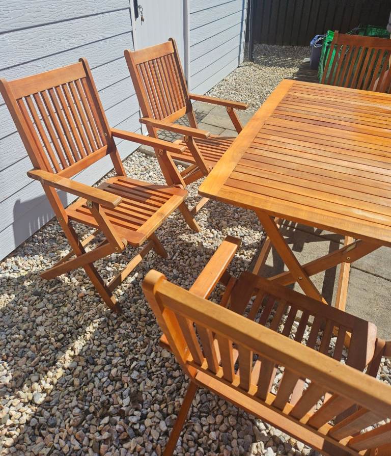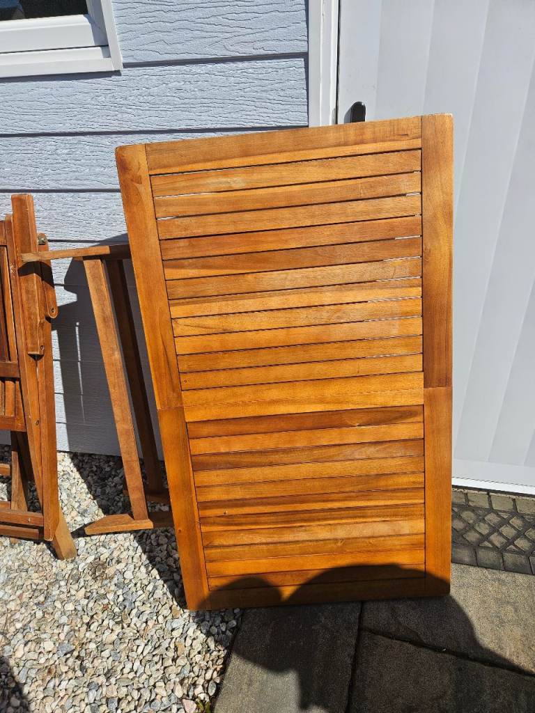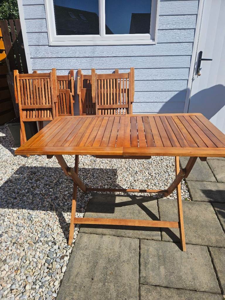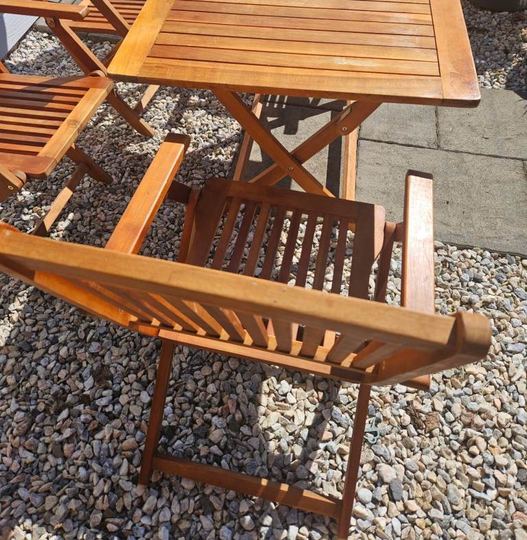 Wooden table & 4 chairs with arms in excellent condition. As seen in photos can be folded flat. Size of table approx 70x120cm.
