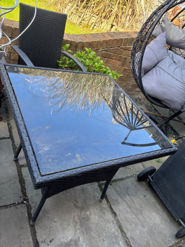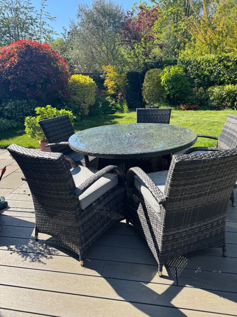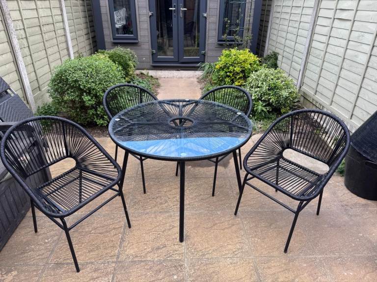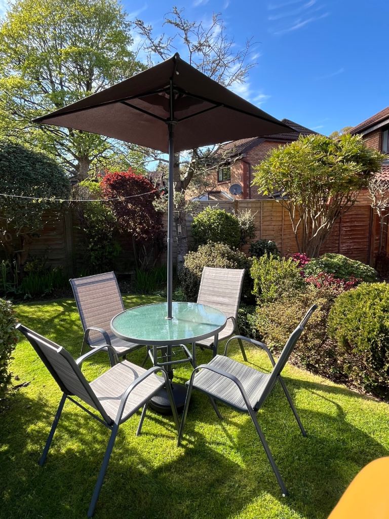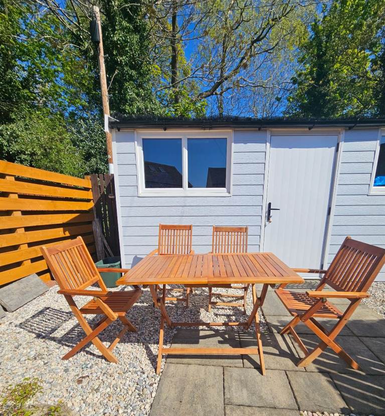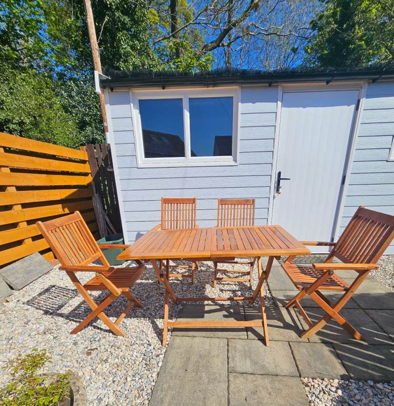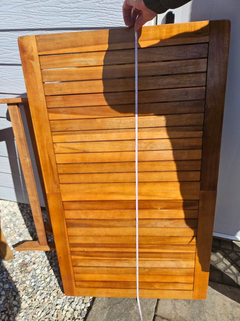 Wooden table & 4 chairs with arms in excellent condition. As seen in photos can be folded flat. Size of table approx 70x120cm.