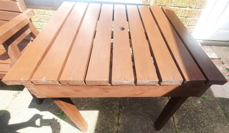 Transform your patio or garden with this fully assembled brown solid garden table, it provides a perfect space for outdoor dining and entertaining, combining style, strength, and durability, No rot, has a hole for parasol, I can help load
