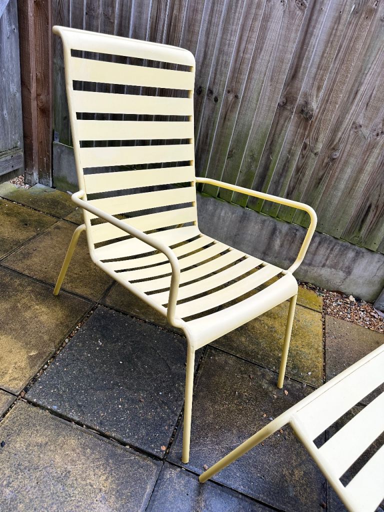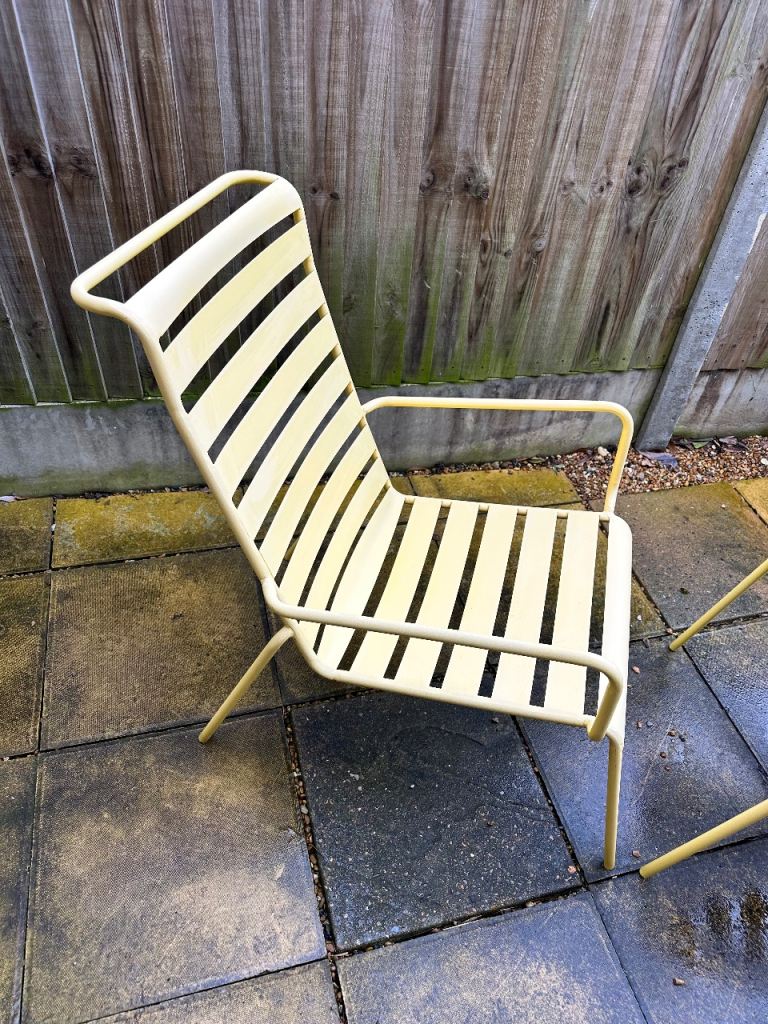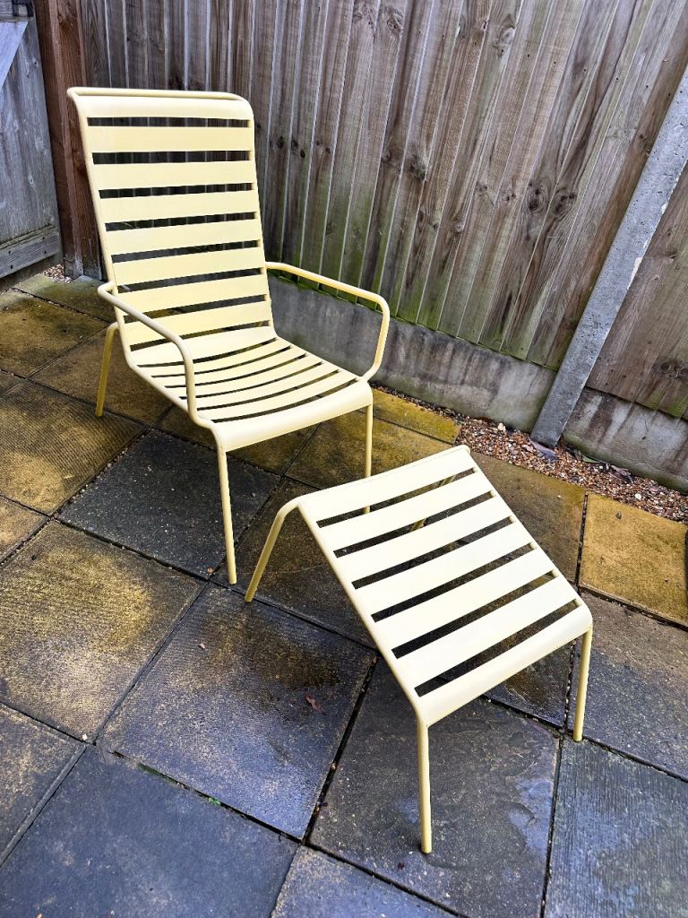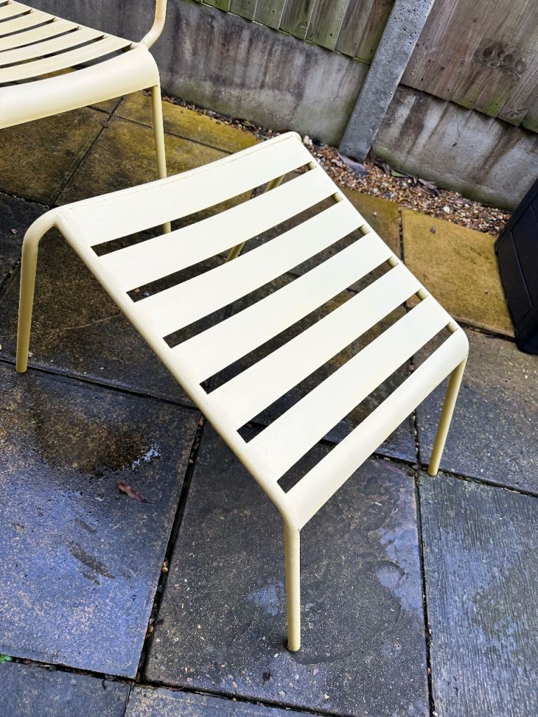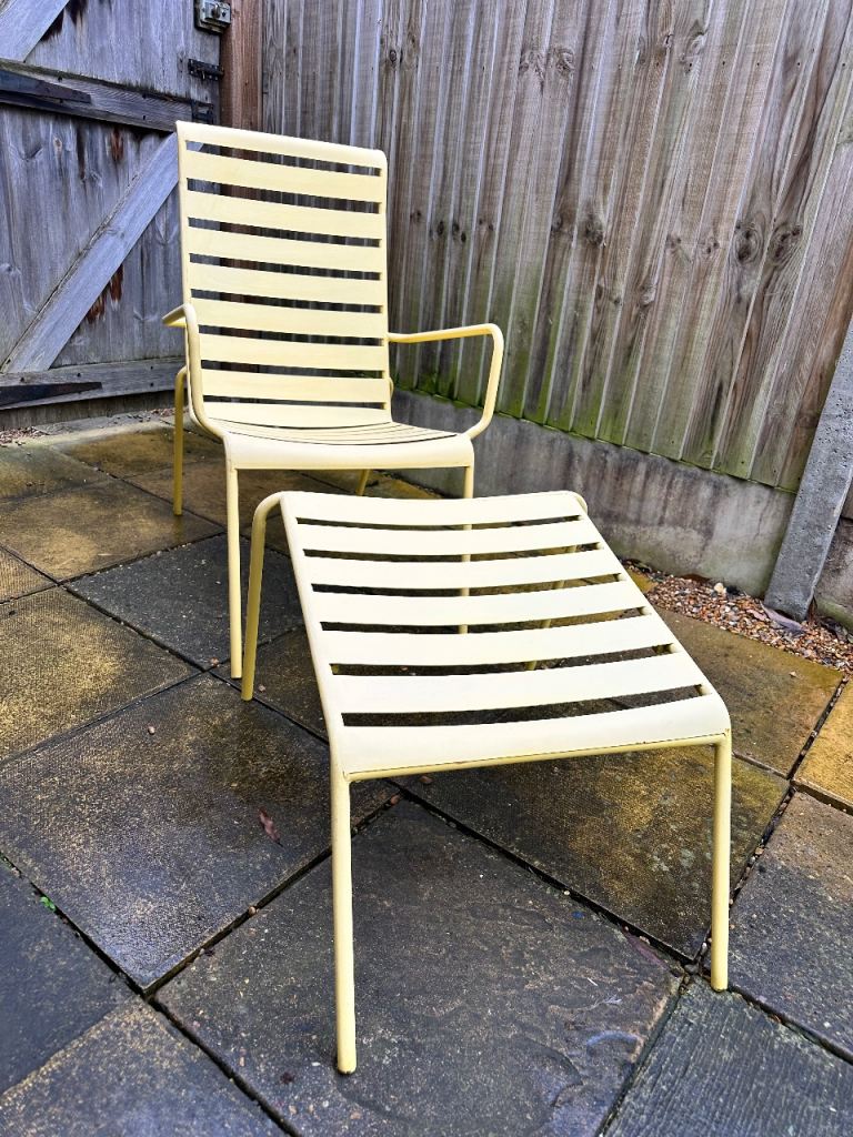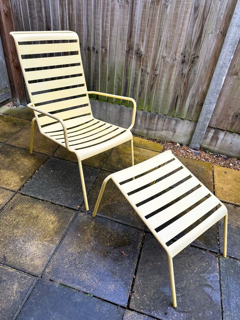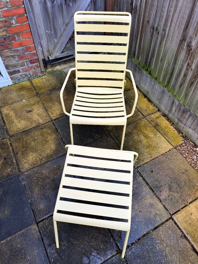 Lovely Yellow Powder Coated aluminum outdoor lounge chair and matching footstool in a vintage style.