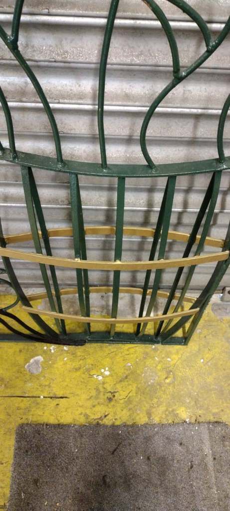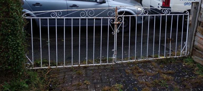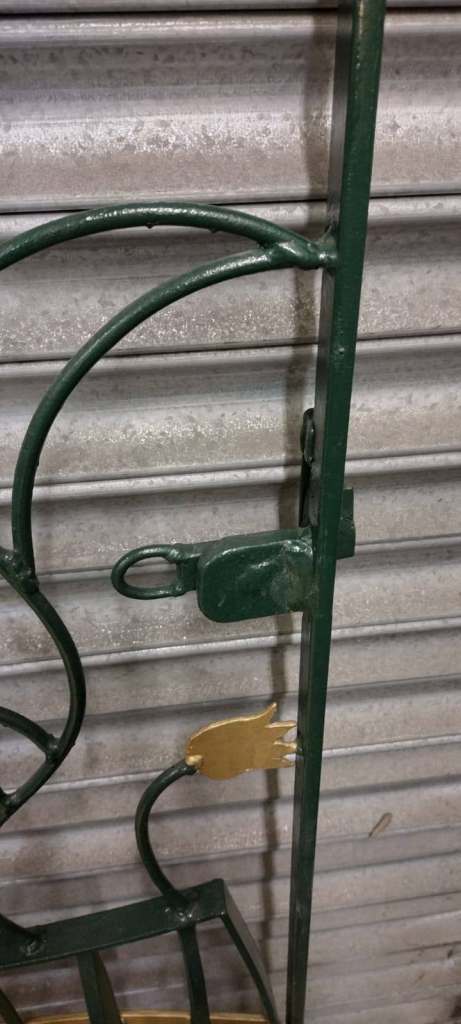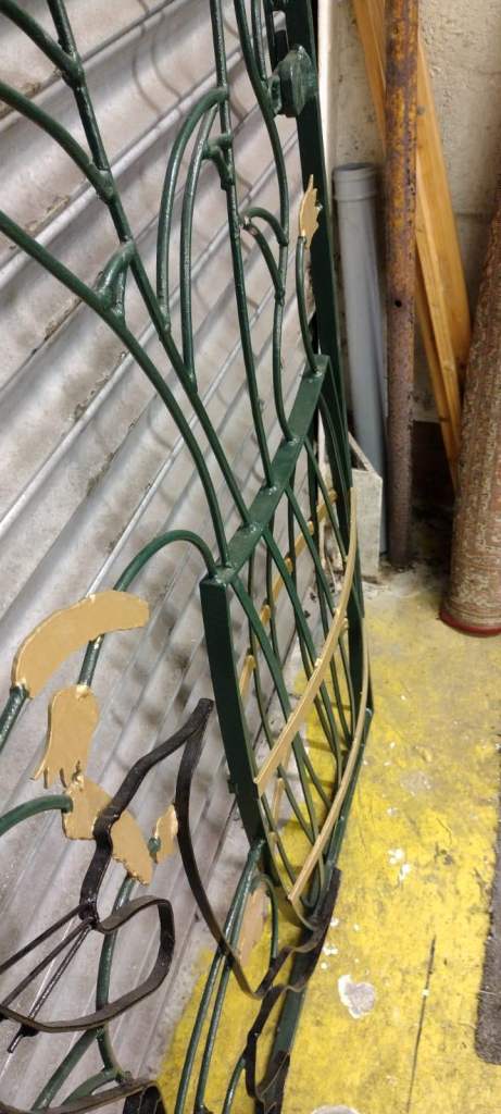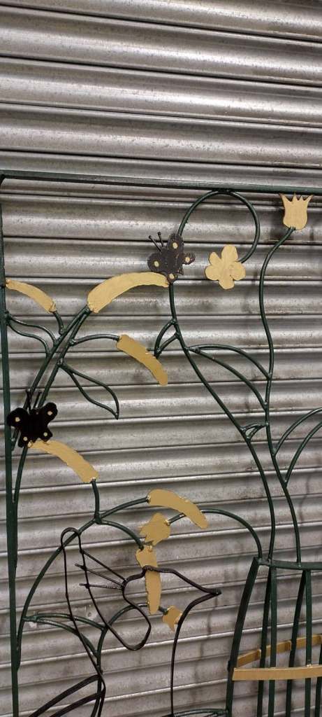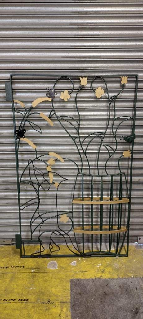 Hand crafted steel gate featuring a cat reaching up to butterflies on a buddleia bush.