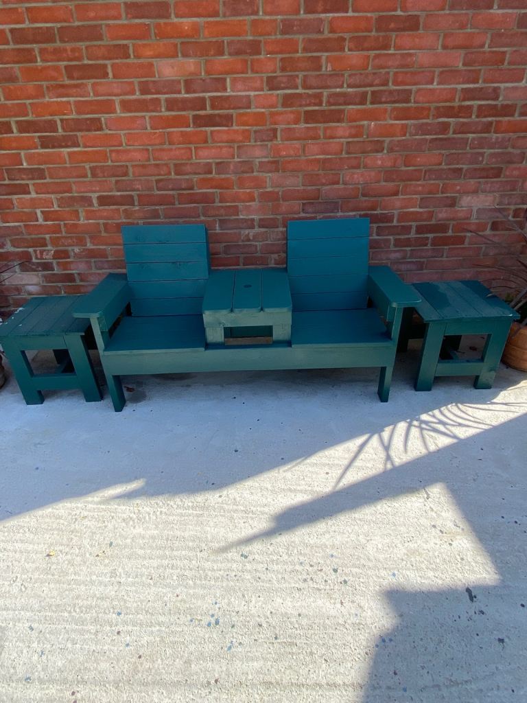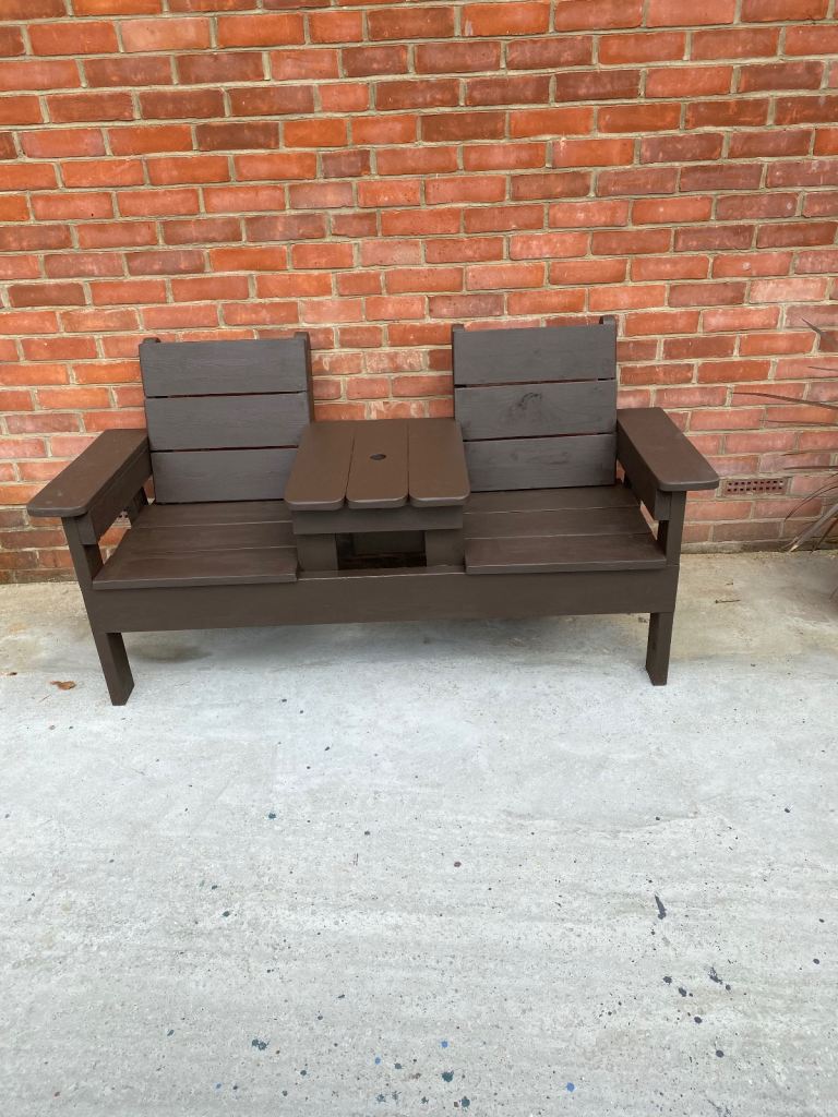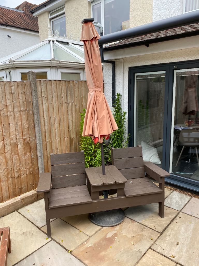 Solid hand built love seat with cut out for parasol. £170 unpainted £190 painted any colour from cuprinol garden shades ready mixed section. Single matching chairs £75 each unpainted £90 each painted.