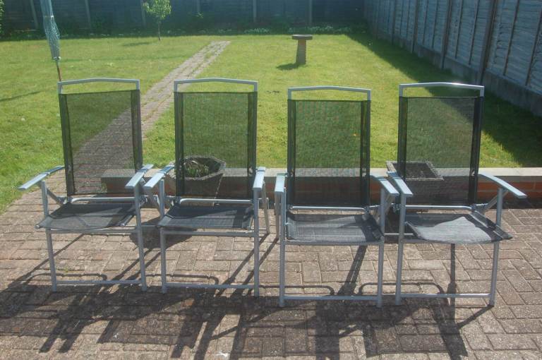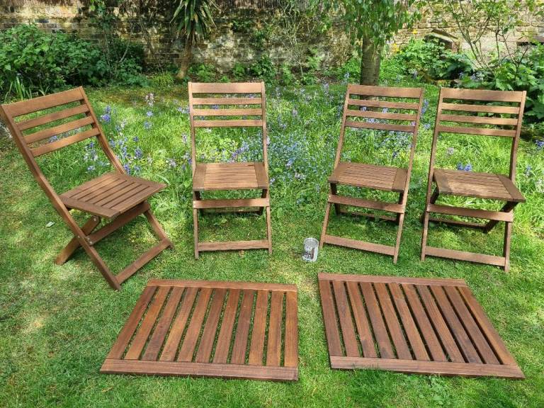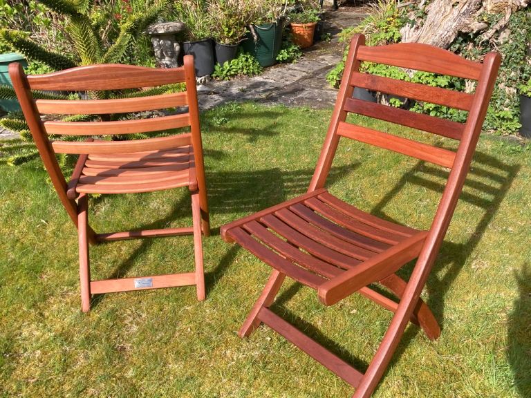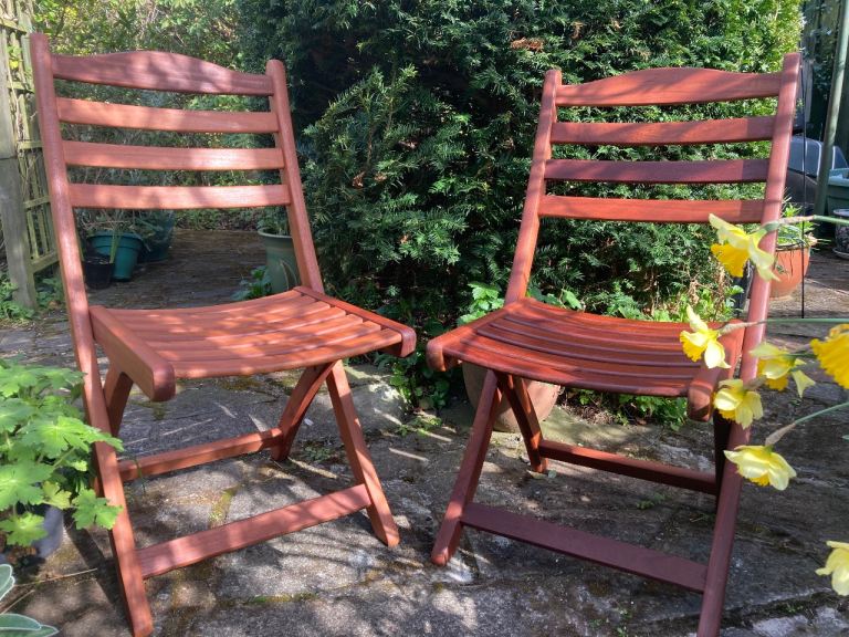 Solid and sturdy, teak folding garden chairs. Made by Alexander Rose. Only used once or twice. As new. Oiled and ready for the season ahead. £65 for the pair.