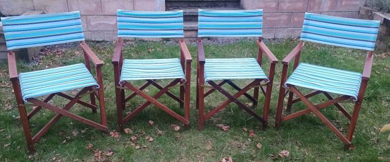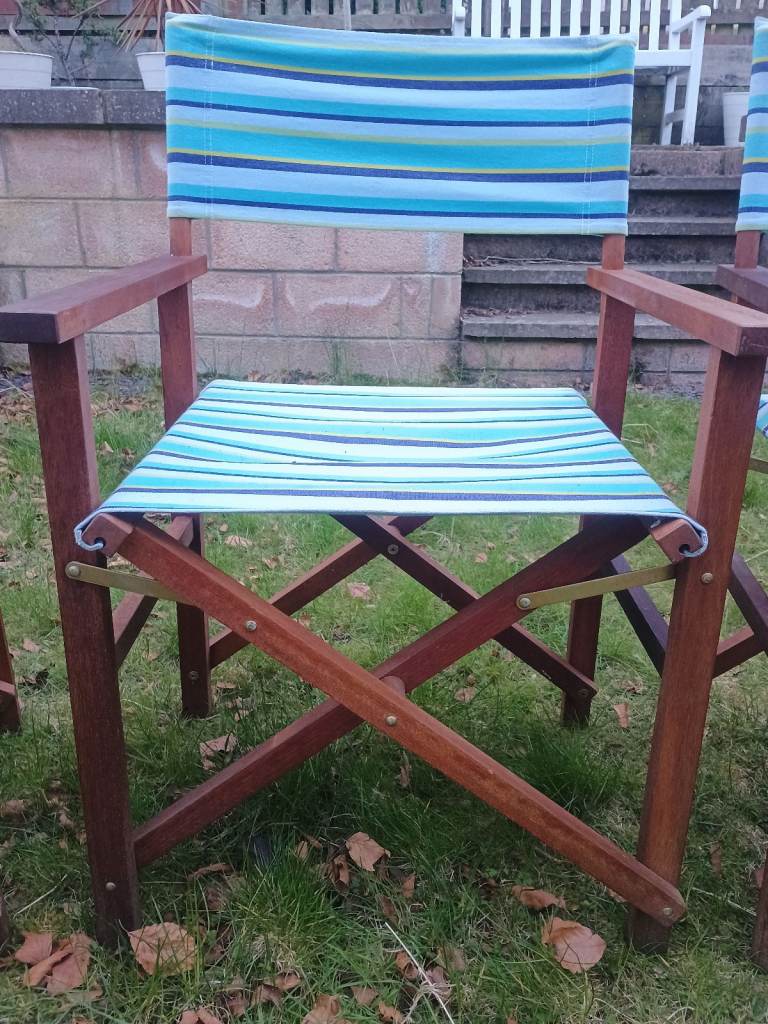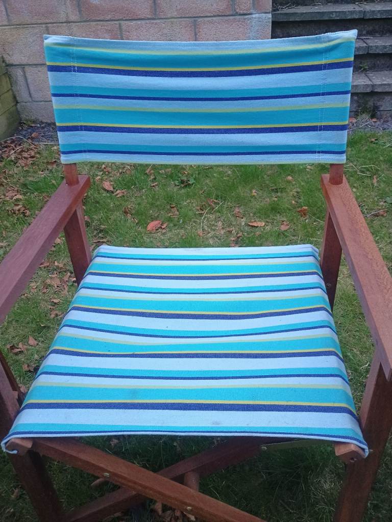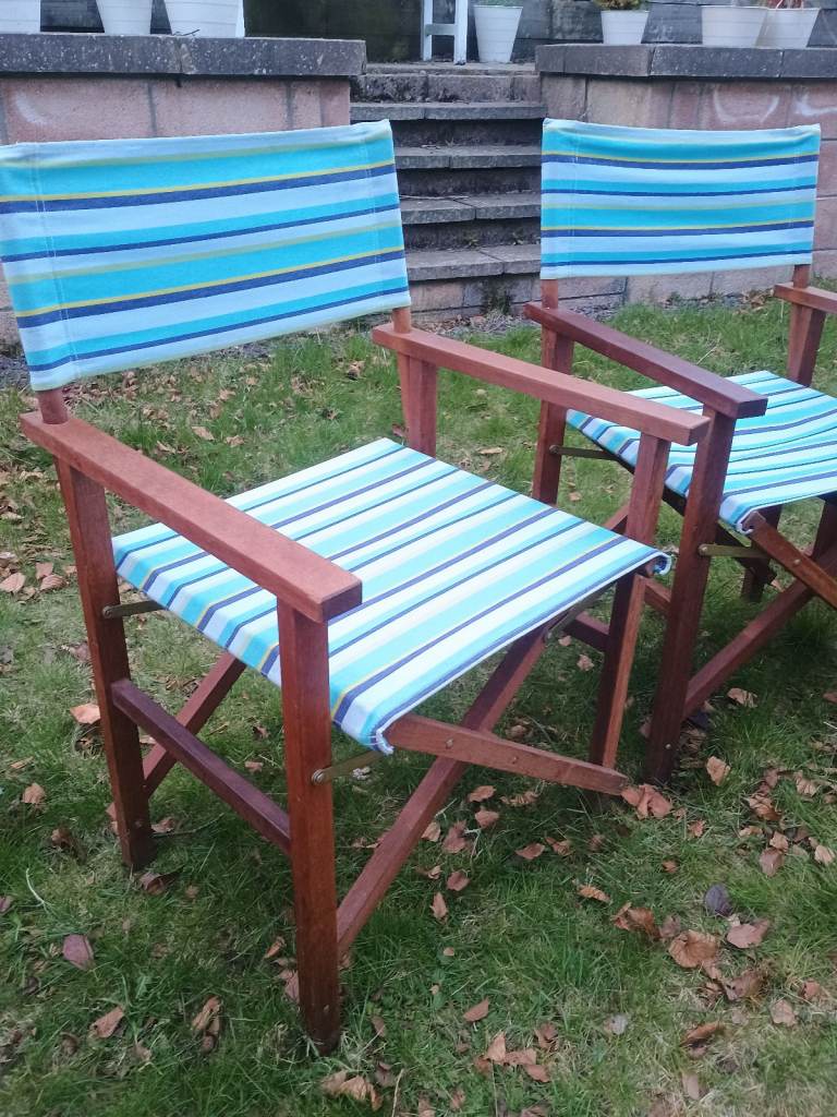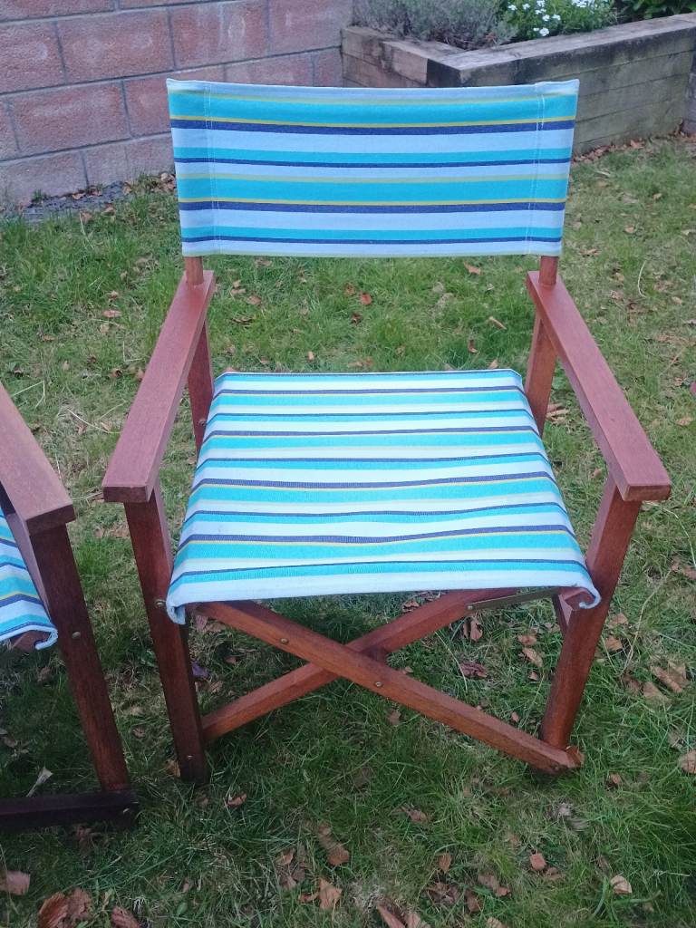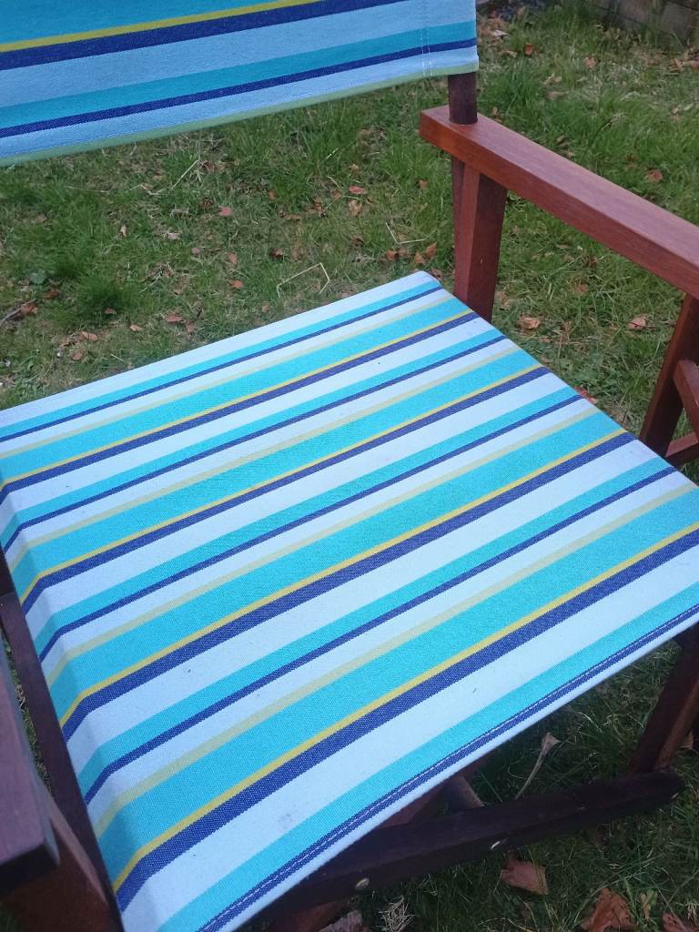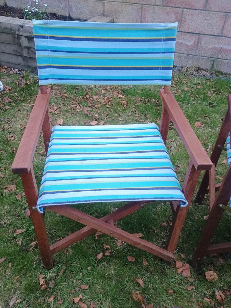 2 x Folding Wooden Canvas Directors Garden Deck Chairs Retro Vintage Striped Beach Hut Camper Van Campervan