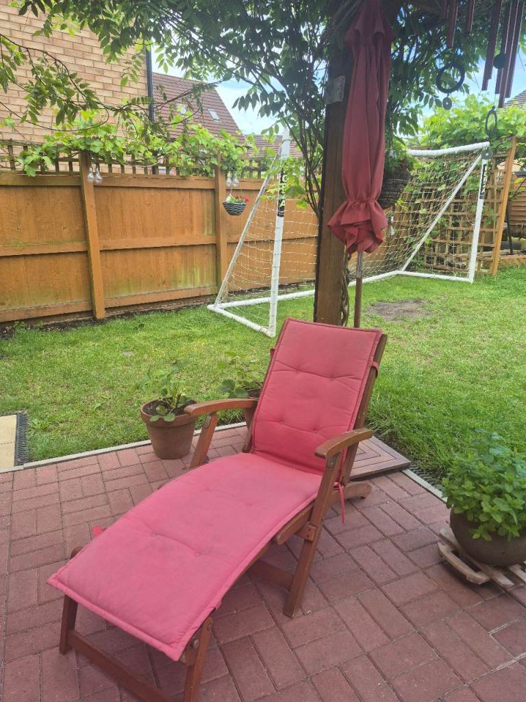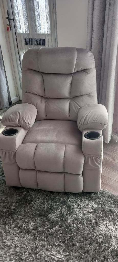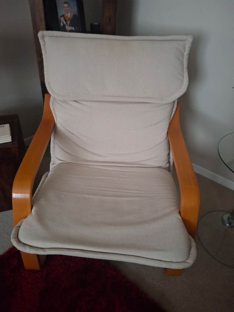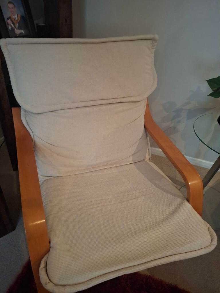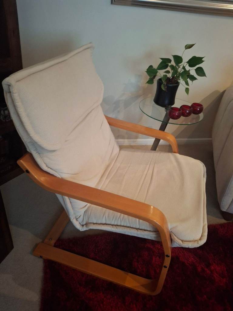 Armchair with a light-wood frame and a light beige cushion originally bought from Relax in Elgin. Very rarely used. Comes from a smoke and pet free home.